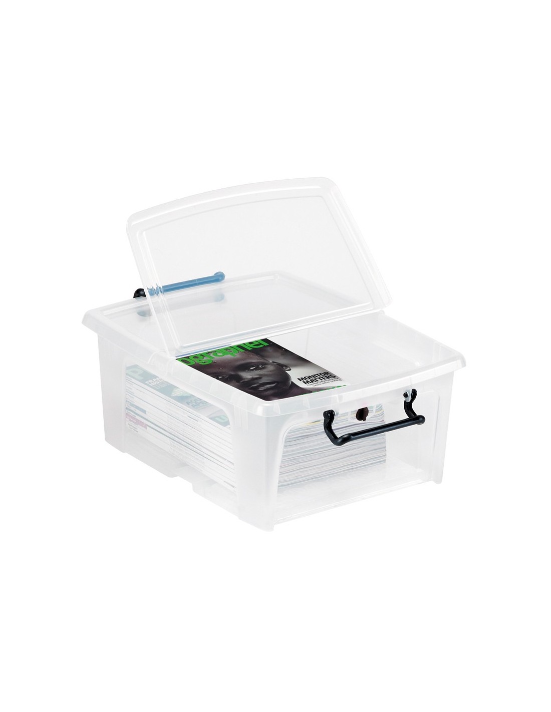 Contenedor de almacenamiento. Clip de apertura de la tapa en los 2 lados para un fácil acceso al contenido. 2 pinzas de mango proporcionan un cierre seguro. Borde ancho alrededor del perímetro para llevar fácilmente la caja. Ruedas para un mejor desplazamiento. Apilable. Contenido no incluido.