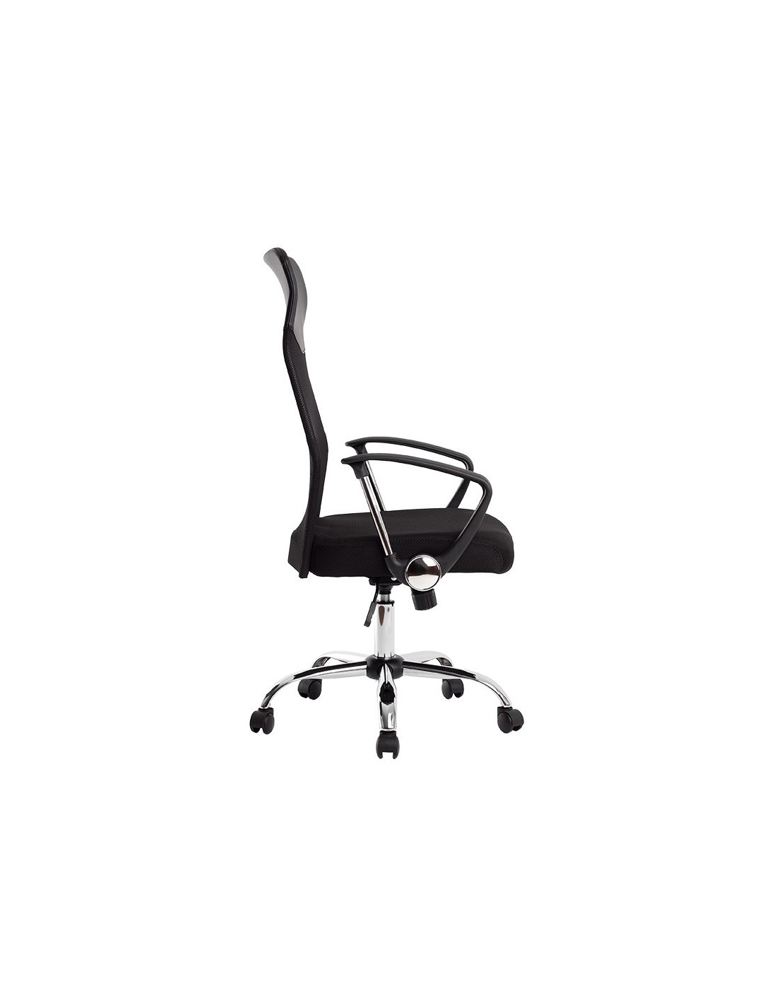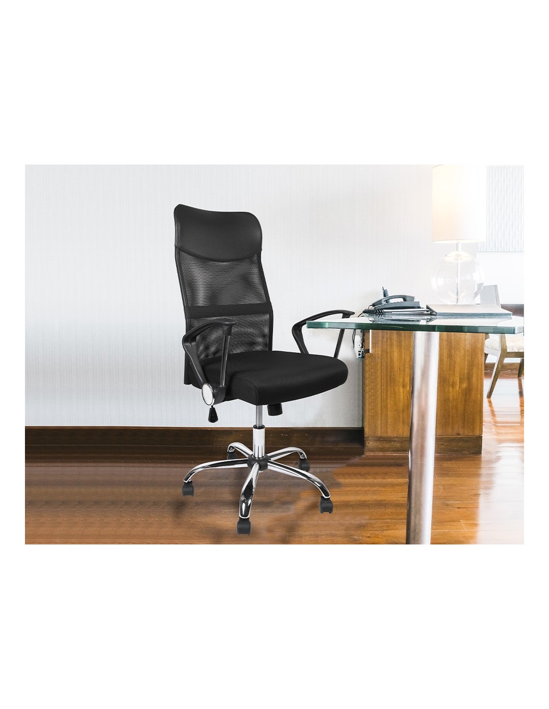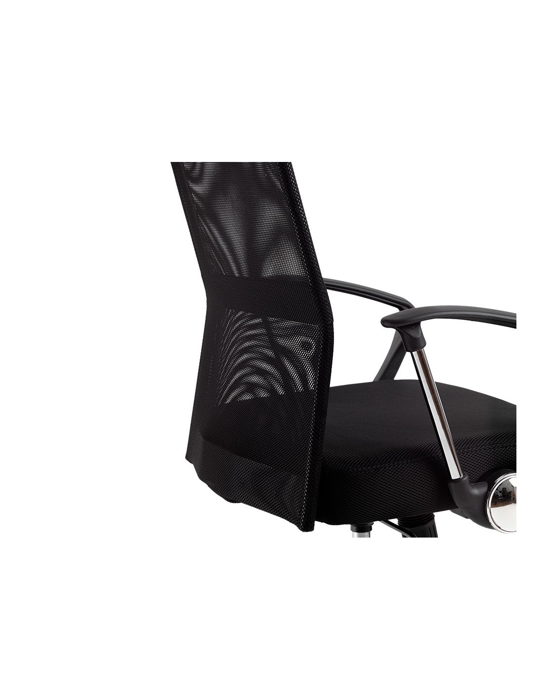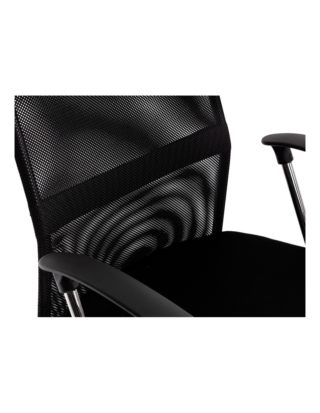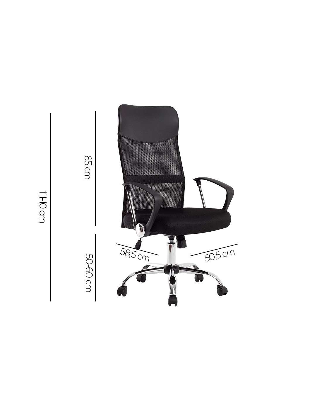 Silla ergonómica giratoria 360°. Asiento y respaldo: tapizados en tejido símilpiel color negro, respaldo con malla en el respaldo de color negro. Pistón: de gas para regulación de altura. Base: cromada de alta resistencia y 5 radios. Altura de la silla: 111 + 10 cm. Altura del respaldo: 65 cm. Altura del asiento: 50-60 cm. Ancho del asiento: 50,5 cm. Profundidad del asiento: 50,5 cm. Brazos: fijos de polipropileno. Ruedas: De nylon. 6 cm Ø. Horas de uso: 8 horas. Peso de la silla / peso máximo soportado: 12,6 kg / 130 kg.