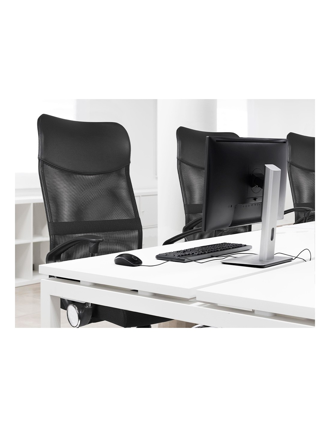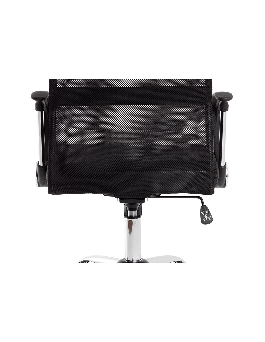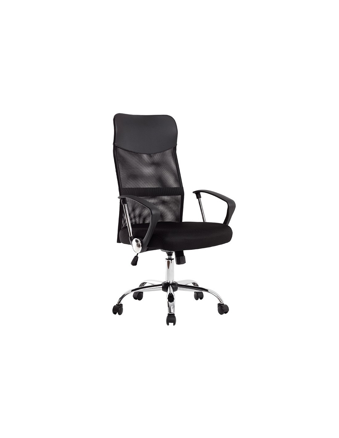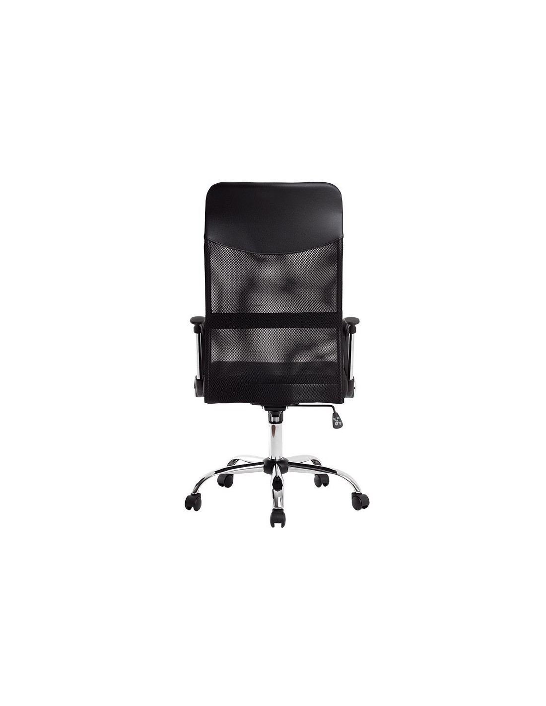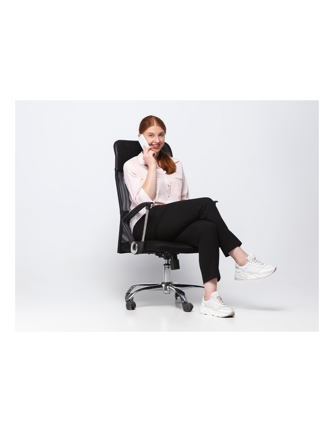 Silla ergonómica giratoria 360°. Asiento y respaldo: tapizados en tejido símilpiel color negro, respaldo con malla en el respaldo de color negro. Pistón: de gas para regulación de altura. Base: cromada de alta resistencia y 5 radios. Altura de la silla: 111 + 10 cm. Altura del respaldo: 65 cm. Altura del asiento: 50-60 cm. Ancho del asiento: 50,5 cm. Profundidad del asiento: 50,5 cm. Brazos: fijos de polipropileno. Ruedas: De nylon. 6 cm Ø. Horas de uso: 8 horas. Peso de la silla / peso máximo soportado: 12,6 kg / 130 kg.