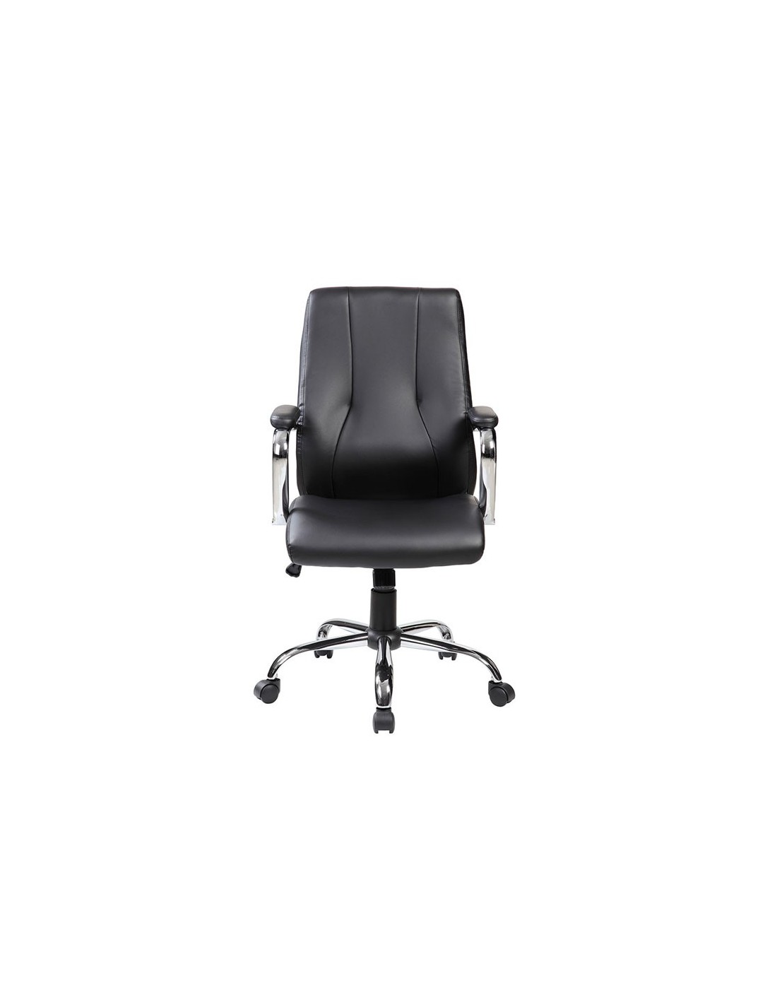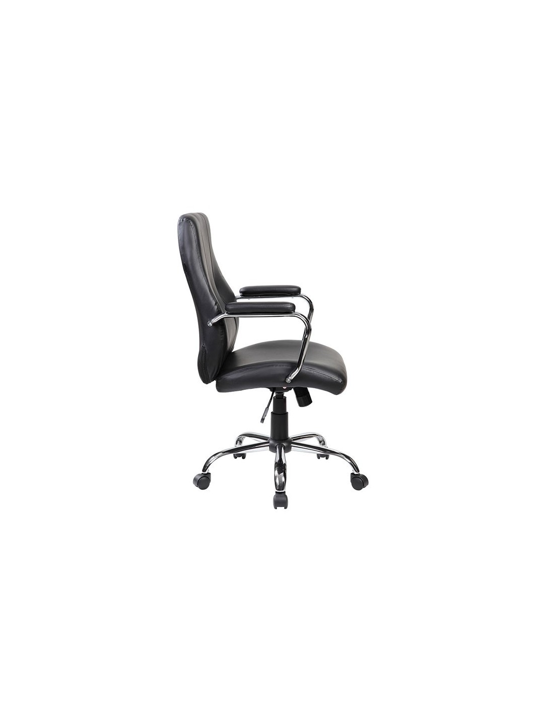 Silla ergonómica giratoria 360°. Asiento y respaldo: en espuma. Tapizados en símil piel. Color negro. Pistón: de gas de fácil activación. Base: metálica cromada con 5 ruedas. Altura de la silla: 100 + 9,4 cm. Altura del respaldo: 55 cm. Altura del asiento: 49-56 cm. Ancho del asiento: 50 cm. Profundidad del asiento: 51 cm. Brazos: aluminio con recubrimiento en símil piel. Ruedas: nylon de 5 cm Ø. Horas de uso: 8 horas. Peso de la silla / peso máximo soportado: 17 kg / 125 kg. Cumple normativa UNE-EN 1335-1/-2
