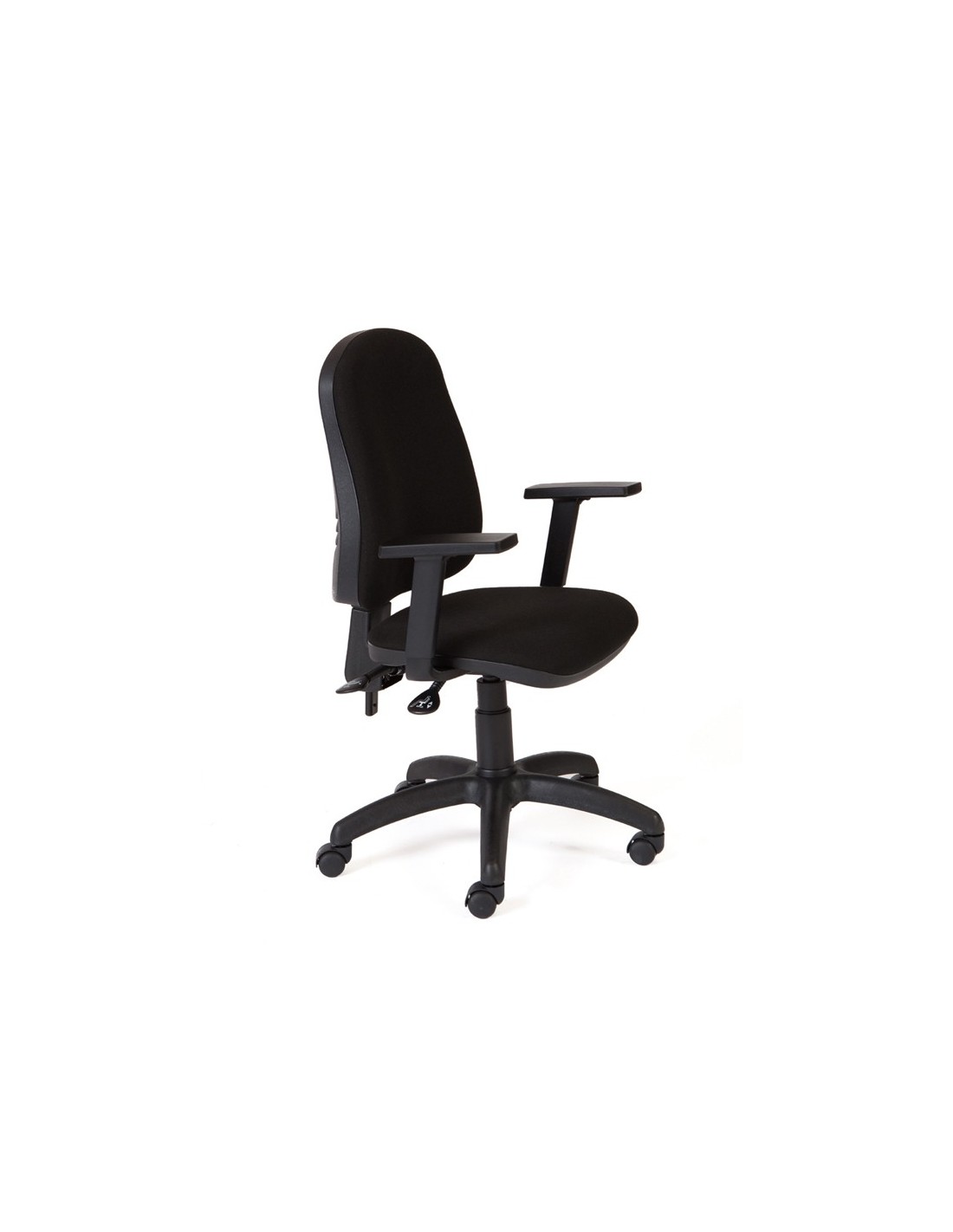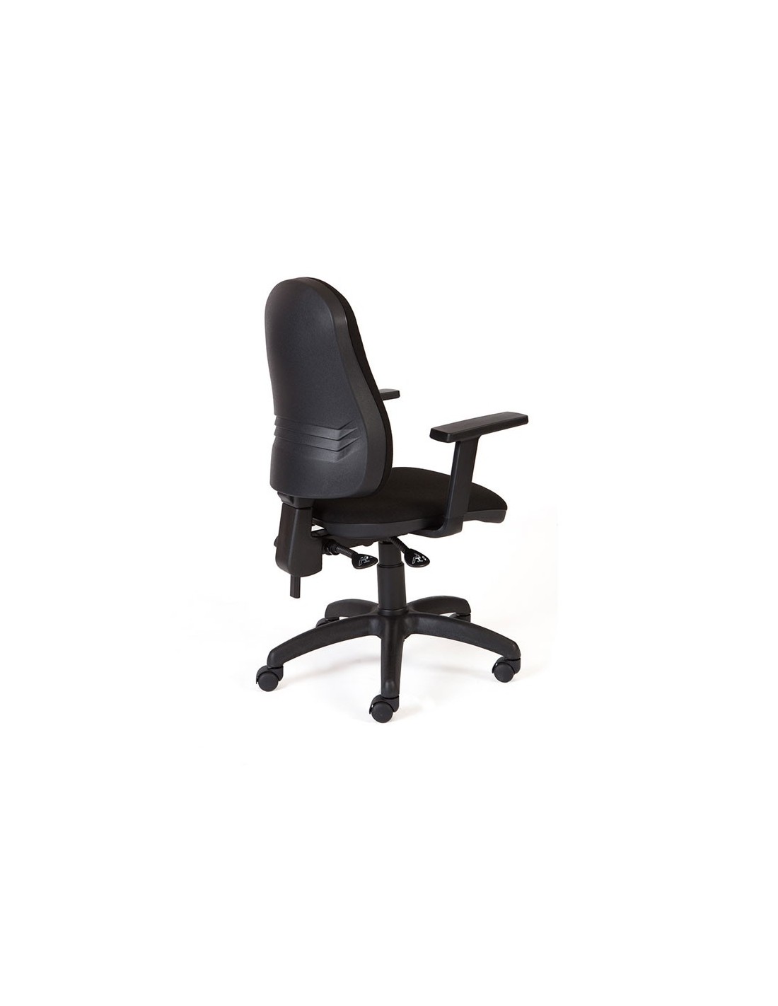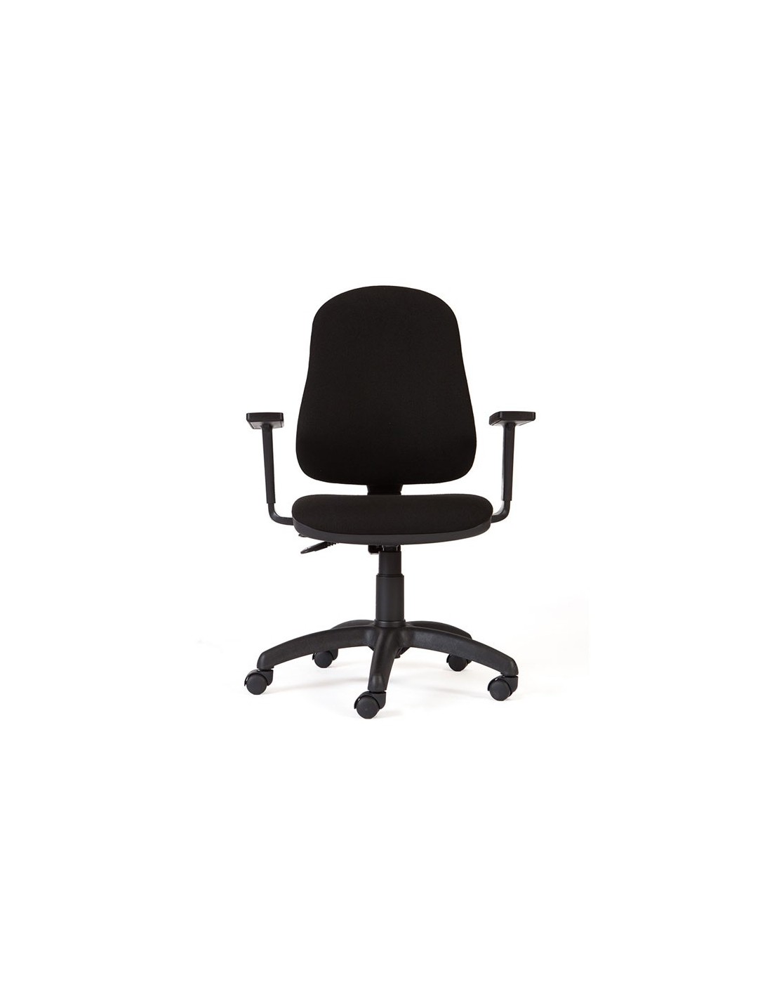 Silla giratoria regulable en altura. Respaldo alto regulable en altura y asiento tapizado sobre espuma inyectada. Pistón: de gas para regulación de altura. Base: de nylon. Altura de la silla: 99 +112 cm. Altura del respaldo: 49 cm. Altura del asiento: 46-60 cm. Ancho del asiento: 46 cm. Profundidad del asiento: 44 cm. Brazos: regulables en altura 8 cm. Ruedas: nylon 6 cm Ø. Horas de uso: 8 horas. Peso de la silla /peso soportado: 14 kg /125 kg. Cumple normativa UNE-EN 1335-1/-2