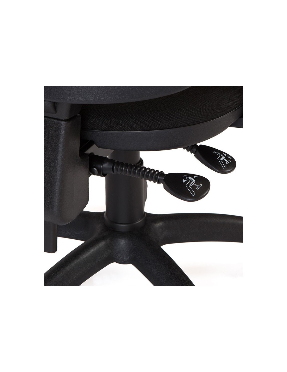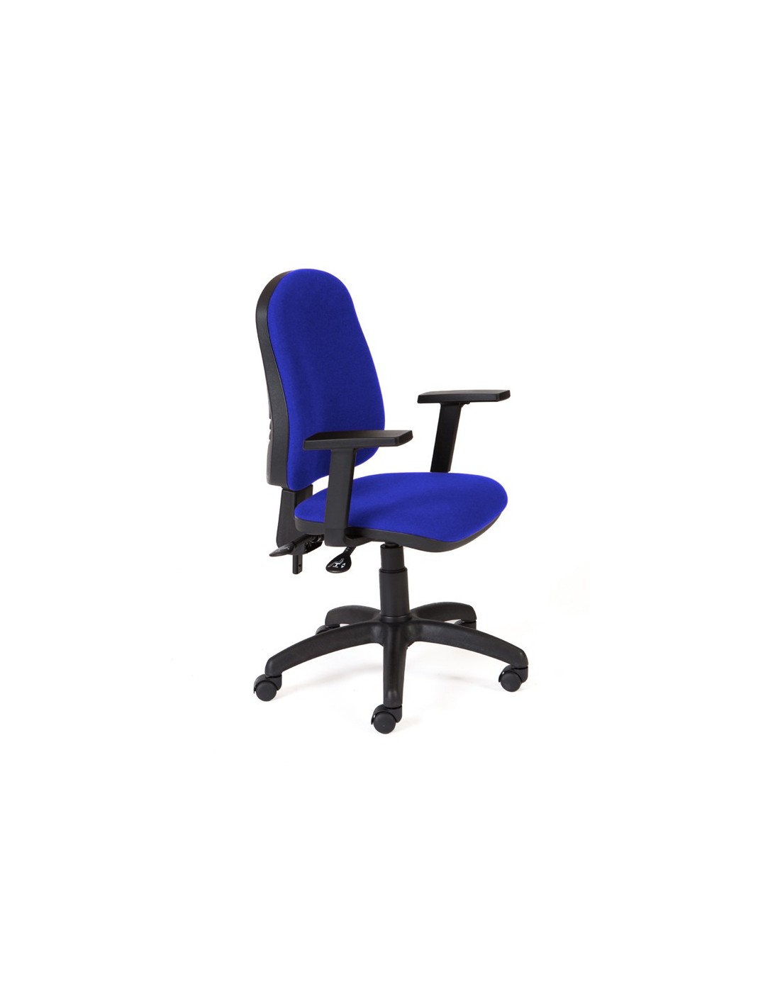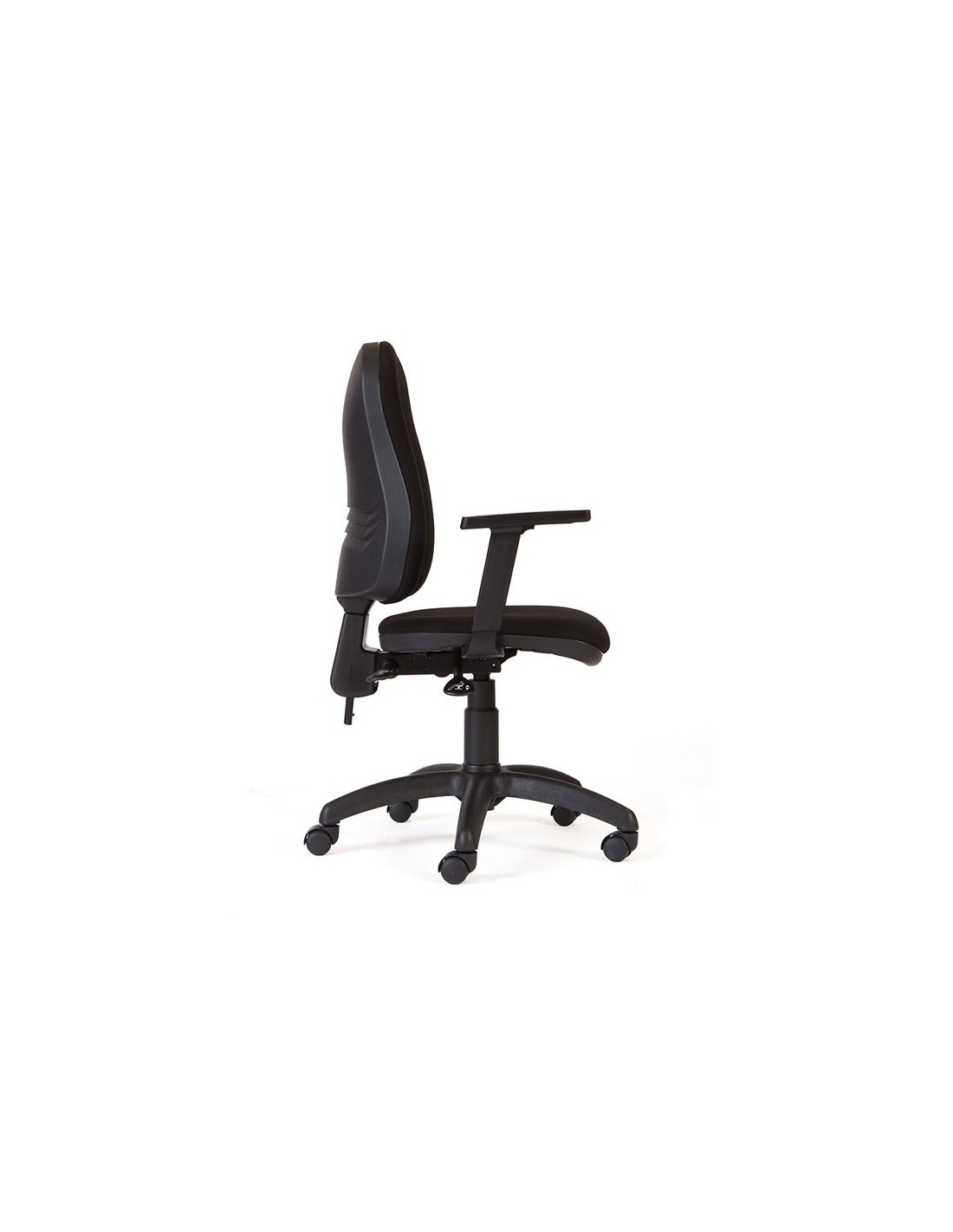 Silla giratoria regulable en altura. Respaldo alto regulable en altura y asiento tapizado sobre espuma inyectada. Pistón: de gas para regulación de altura. Base: de nylon. Altura de la silla: 99 +112 cm. Altura del respaldo: 49 cm. Altura del asiento: 46-60 cm. Ancho del asiento: 46 cm. Profundidad del asiento: 44 cm. Brazos: regulables en altura 8 cm. Ruedas: nylon 6 cm Ø. Horas de uso: 8 horas. Peso de la silla /peso soportado: 14 kg /125 kg. Cumple normativa UNE-EN 1335-1/-2