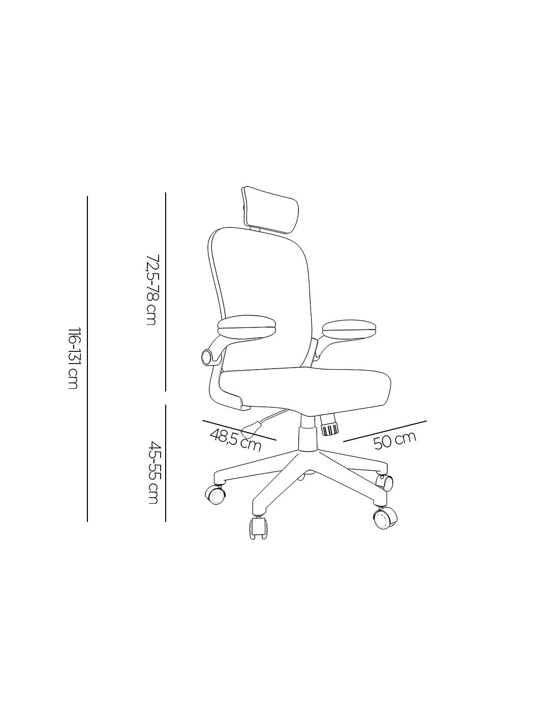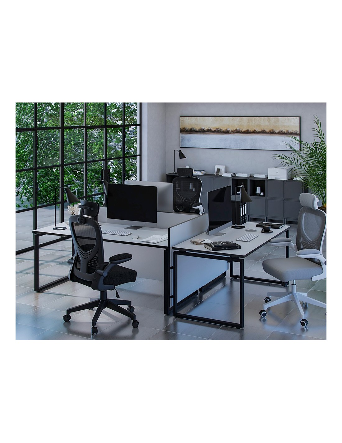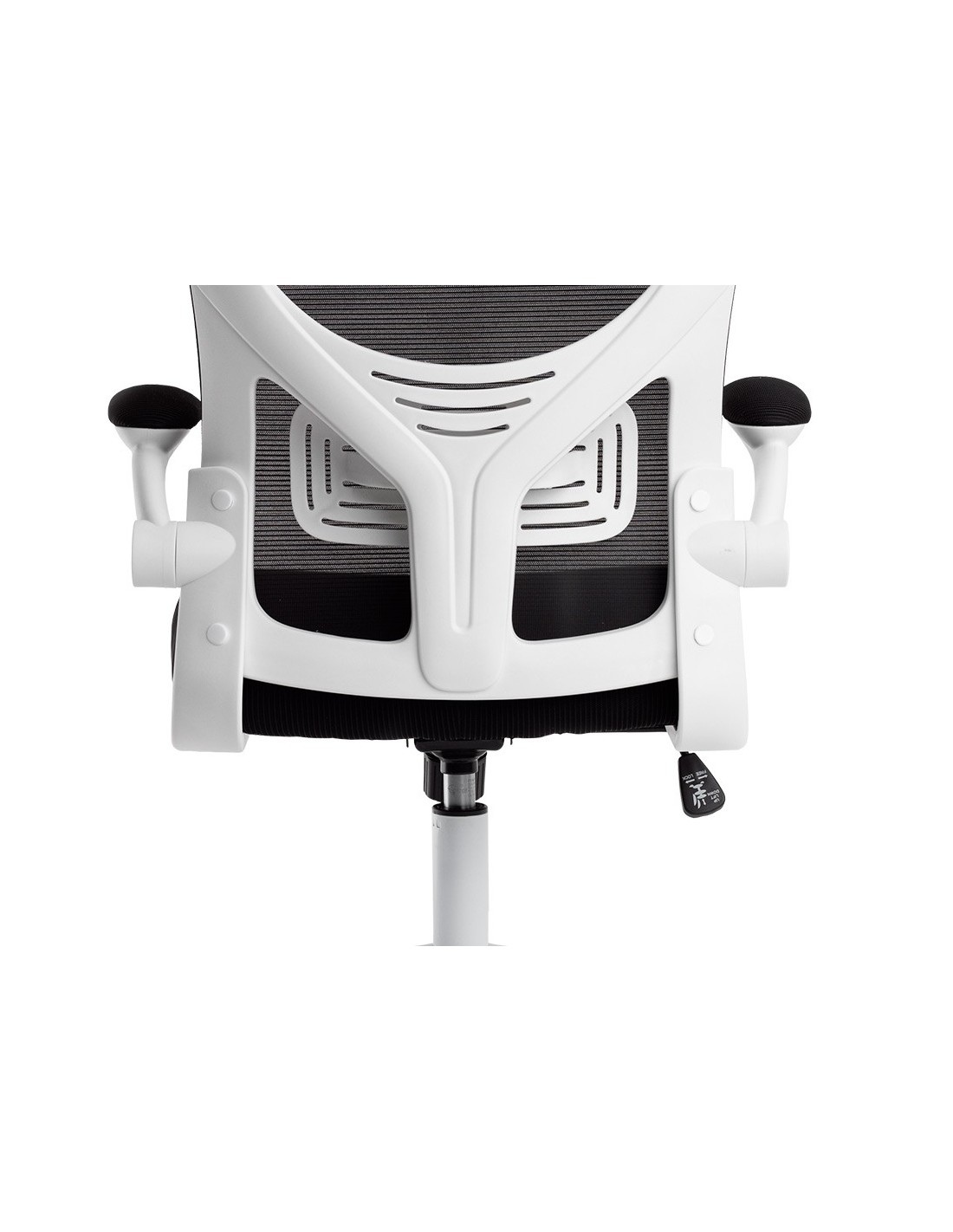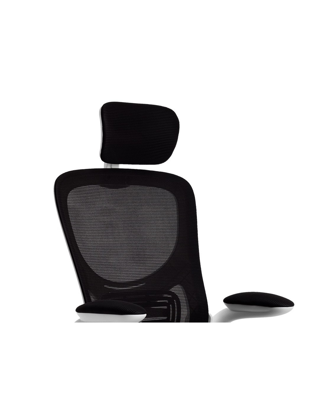 Silla ergonómica de diseño de malla negra con estructura blanca. El equilibrio perfecto entre confort y funcionalidad. Su diseño moderno y funcionalse adapta a cualquier ambiente y aporta un toque de estilo a tu espacio d e trabajo. Cuenta con reposacabezas ajustable que permite personalizar la posición y el apoyo para el cuello y cabeza, asegurando una postura cómodadurante largos períodos de tiempo. Además, cuenta con un refuerzo lumbar que se adapta a la curva natural de tu espalda, brindando un soporte adicional y reduciendo el estrés. La silla está fabricada con materiales de alta calidad, incluyendo una malla transpirable que proporciona una ventilación adecuada, evitando la acumulación de calor. Sus reposabrazos ajustableste permiten encontrar la posición perfecta para tus brazos, lo que contri buye a una postura saludable y cómoda. Además, el mecanismo de mariposa permite ajustar la altura y la inclinación de la silla de acuerdo a tus necesidades y preferencias. Con una base d