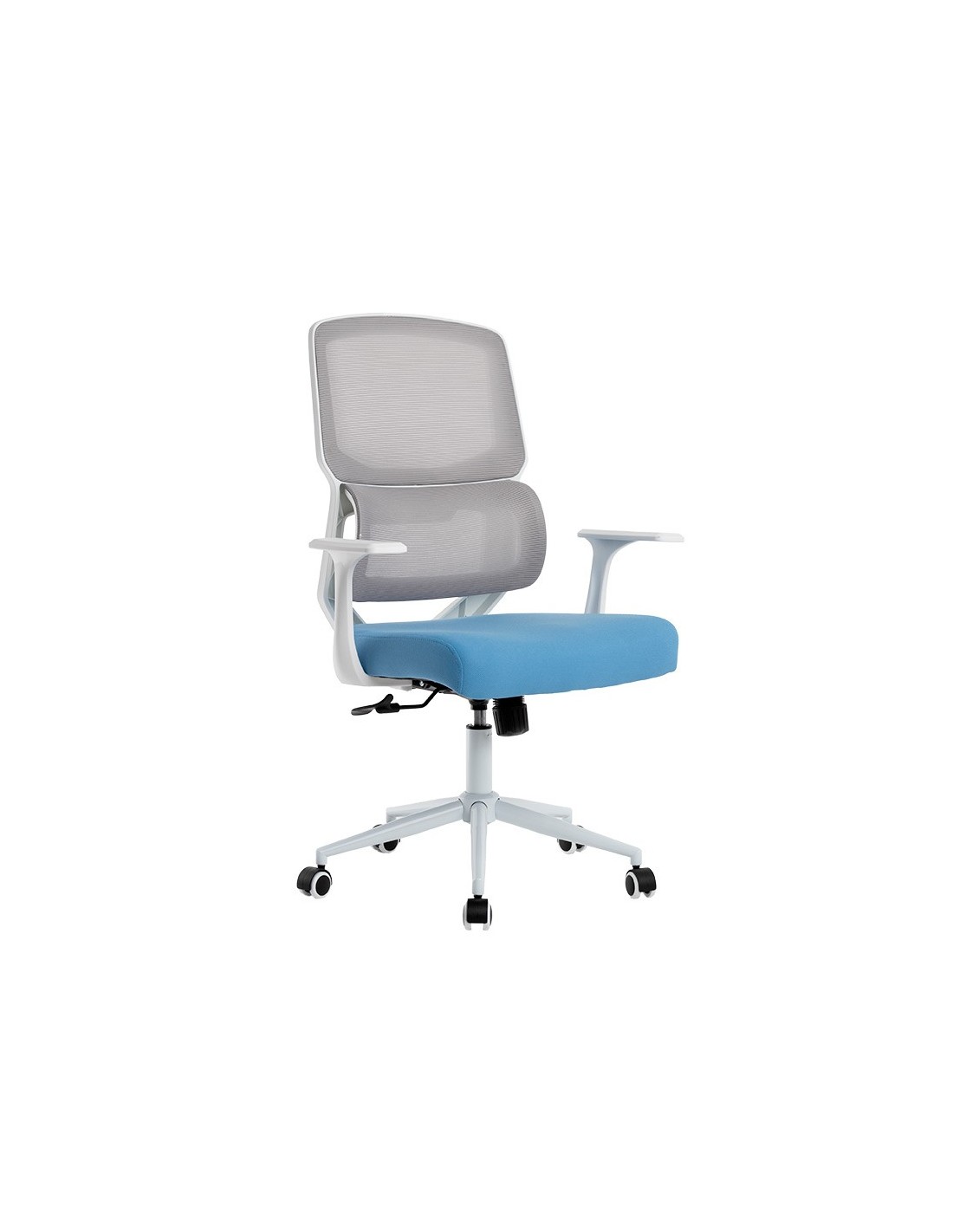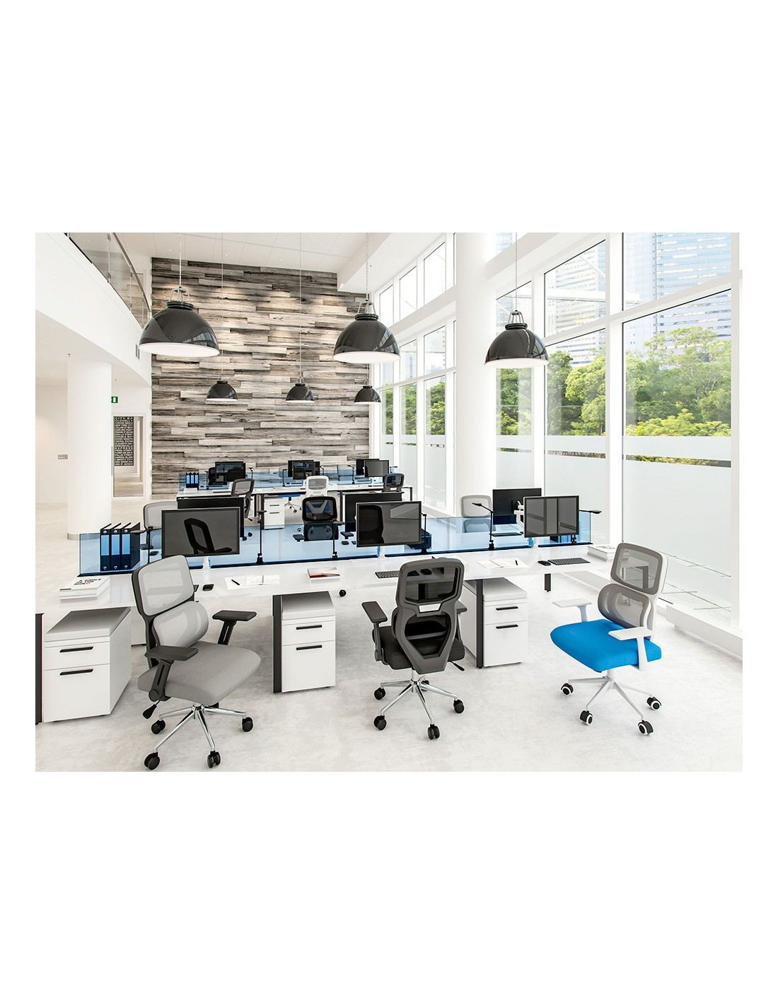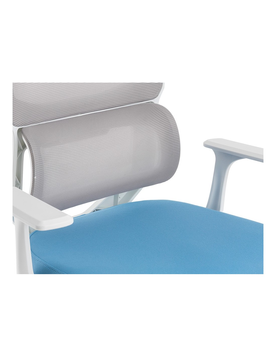 Silla de malla de diseño, con estructura blanca, respaldo de doble compartimento en gris y cojín ultra confortable color azul. Ofrece un soporte adicional y ayuda a aliviar la presión lumbar, evitando la fatiga y promoviendo una postura saludable, permitiendo mantener una postura adecuada y reducir la fatiga durante largas jornadas. El respaldo de malla transpirable proporciona una ventilación adecuada, permitiendo que el aire circule y evitando la acumulación de calor, lo que te mantiene fresco y cómodo incluso en los días más calurosos. Además, la malla es resistente y duradera, asegurando una larga vida útil de la silla. El mecanismo funcional te permite ajustar la incl inación del respaldo y la altura del asiento según tus preferencias y necesidades. La silla cuenta con un gaslift cromado de 100 mm que te permite ajustar la altura de la silla de manera suave y sencilla. La base cromada ofrece estabilidad y resistencia, asegu