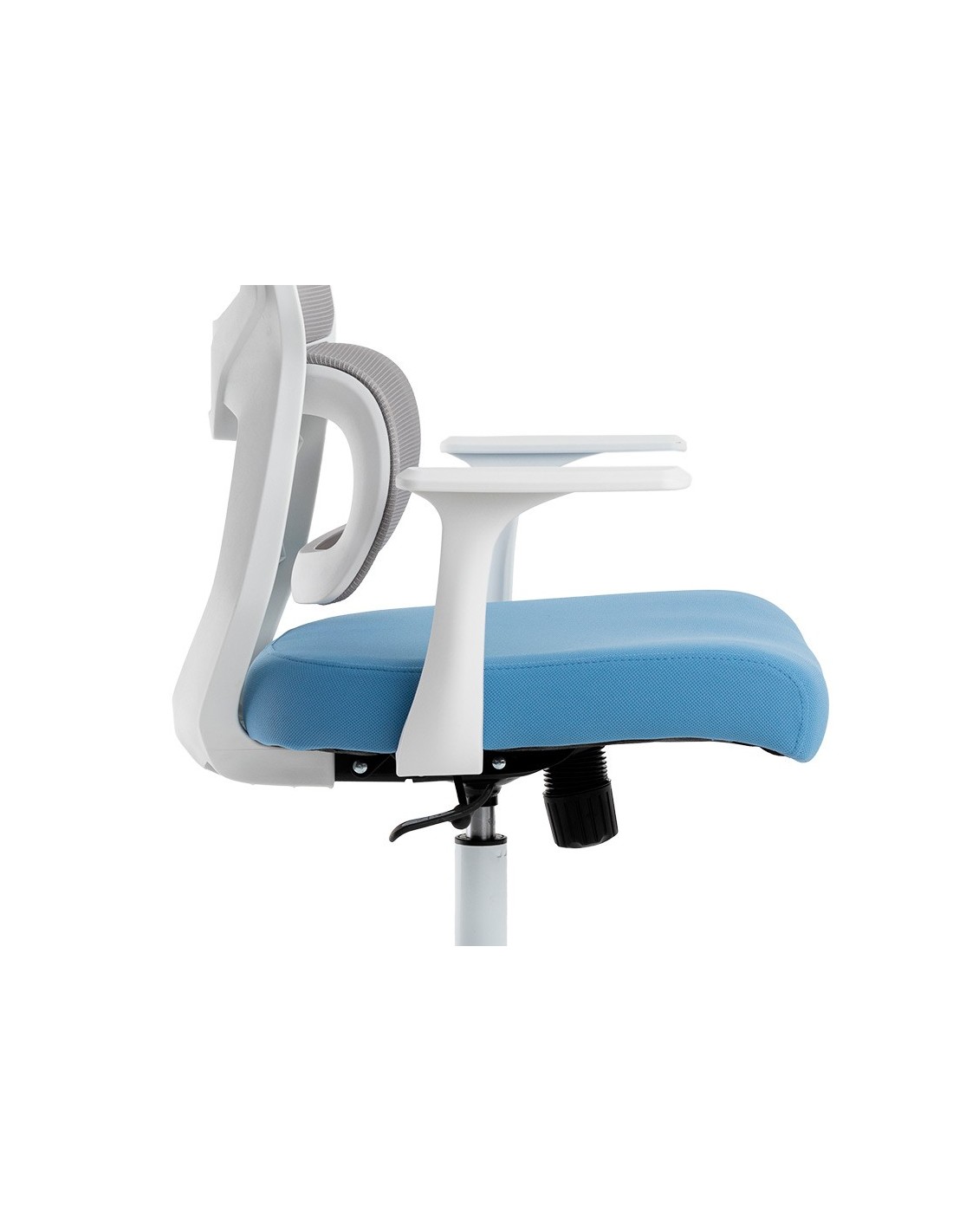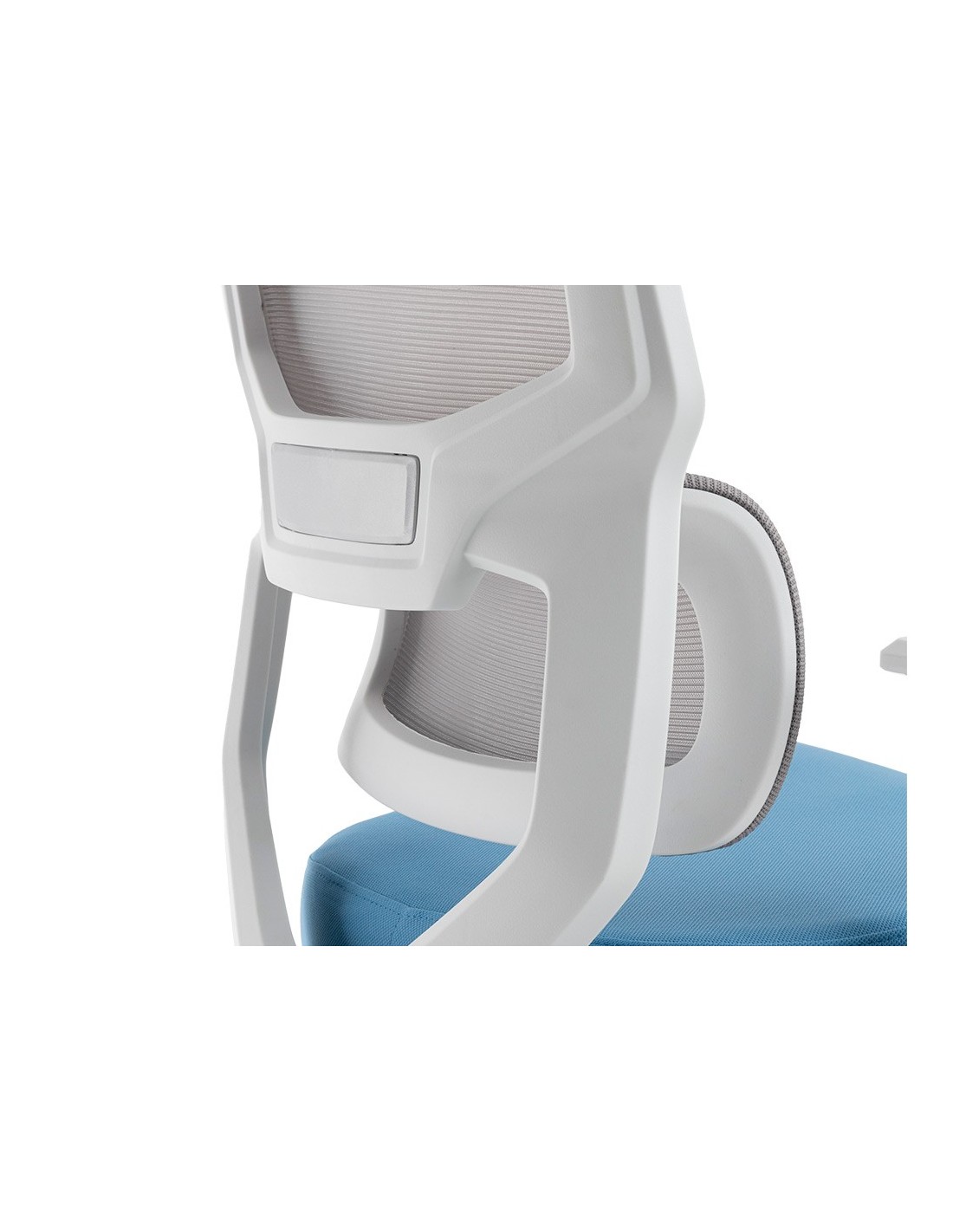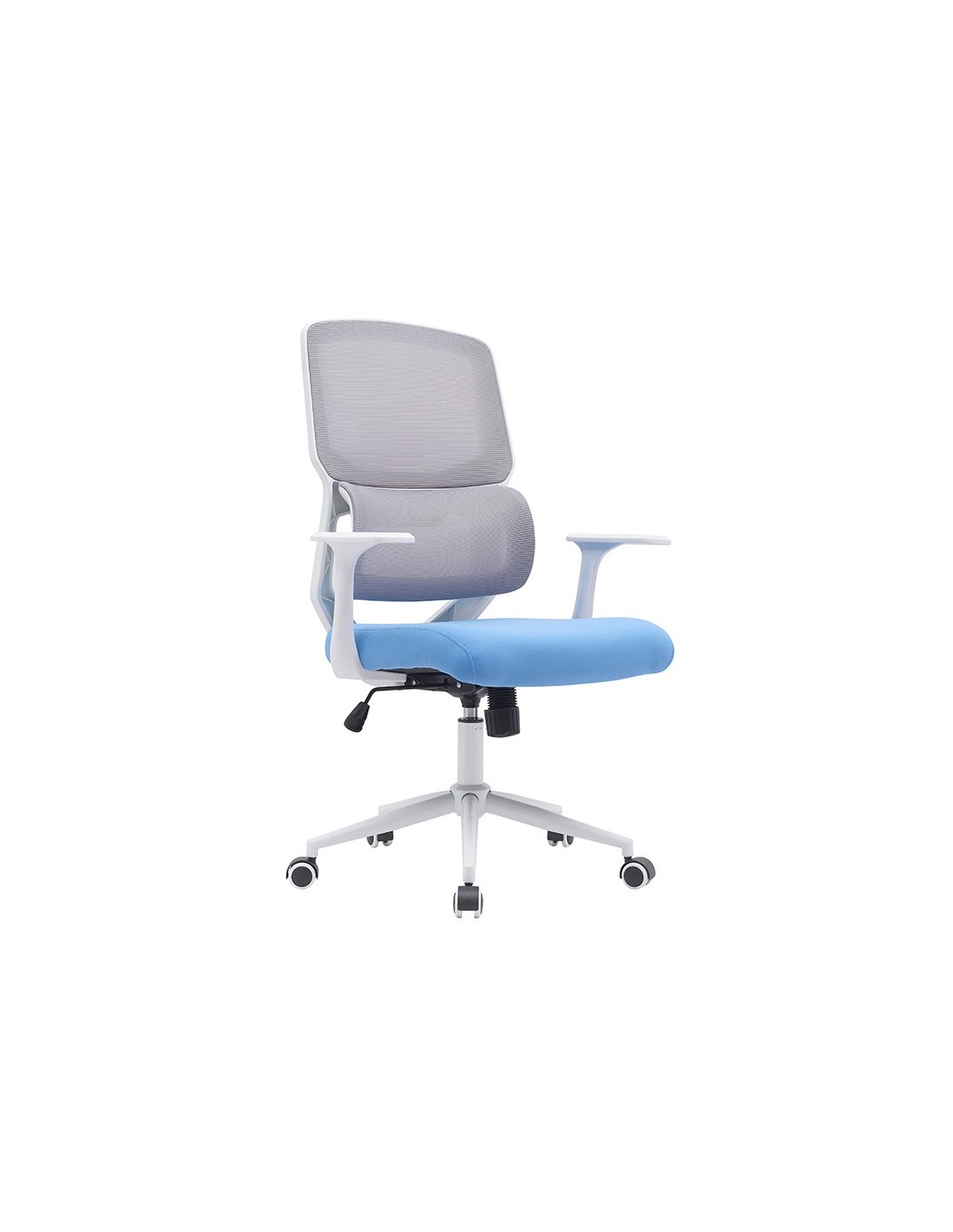 Silla de malla de diseño, con estructura blanca, respaldo de doble compartimento en gris y cojín ultra confortable color azul. Ofrece un soporte adicional y ayuda a aliviar la presión lumbar, evitando la fatiga y promoviendo una postura saludable, permitiendo mantener una postura adecuada y reducir la fatiga durante largas jornadas. El respaldo de malla transpirable proporciona una ventilación adecuada, permitiendo que el aire circule y evitando la acumulación de calor, lo que te mantiene fresco y cómodo incluso en los días más calurosos. Además, la malla es resistente y duradera, asegurando una larga vida útil de la silla. El mecanismo funcional te permite ajustar la incl inación del respaldo y la altura del asiento según tus preferencias y necesidades. La silla cuenta con un gaslift cromado de 100 mm que te permite ajustar la altura de la silla de manera suave y sencilla. La base cromada ofrece estabilidad y resistencia, asegu