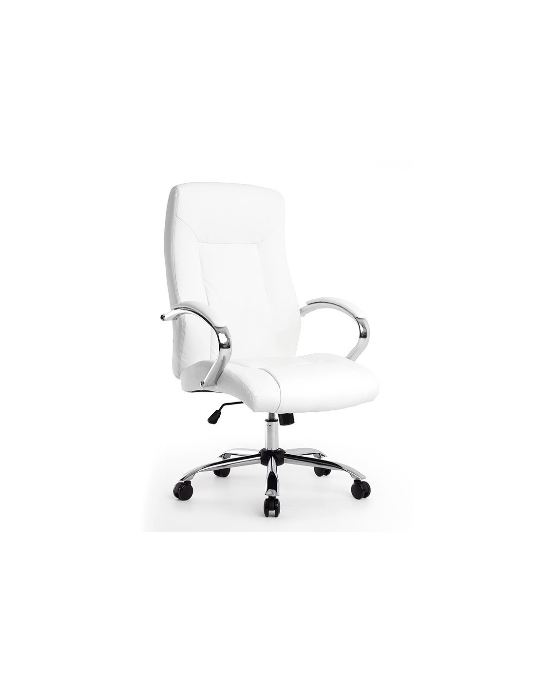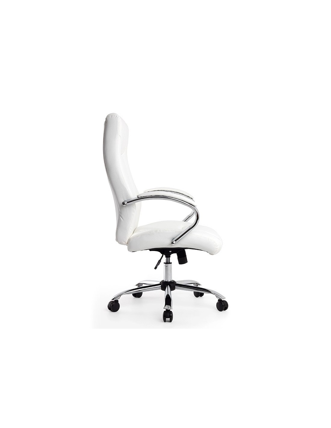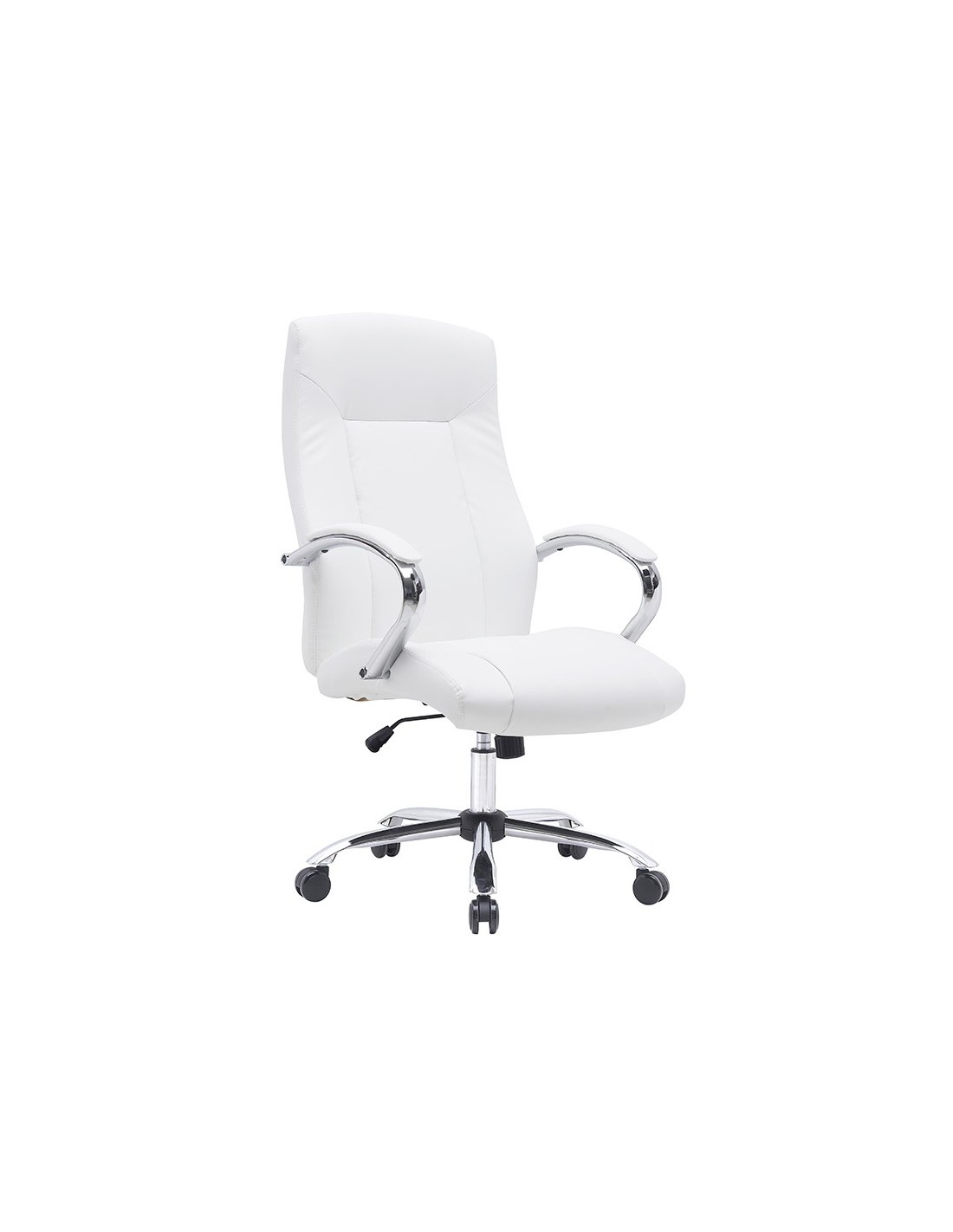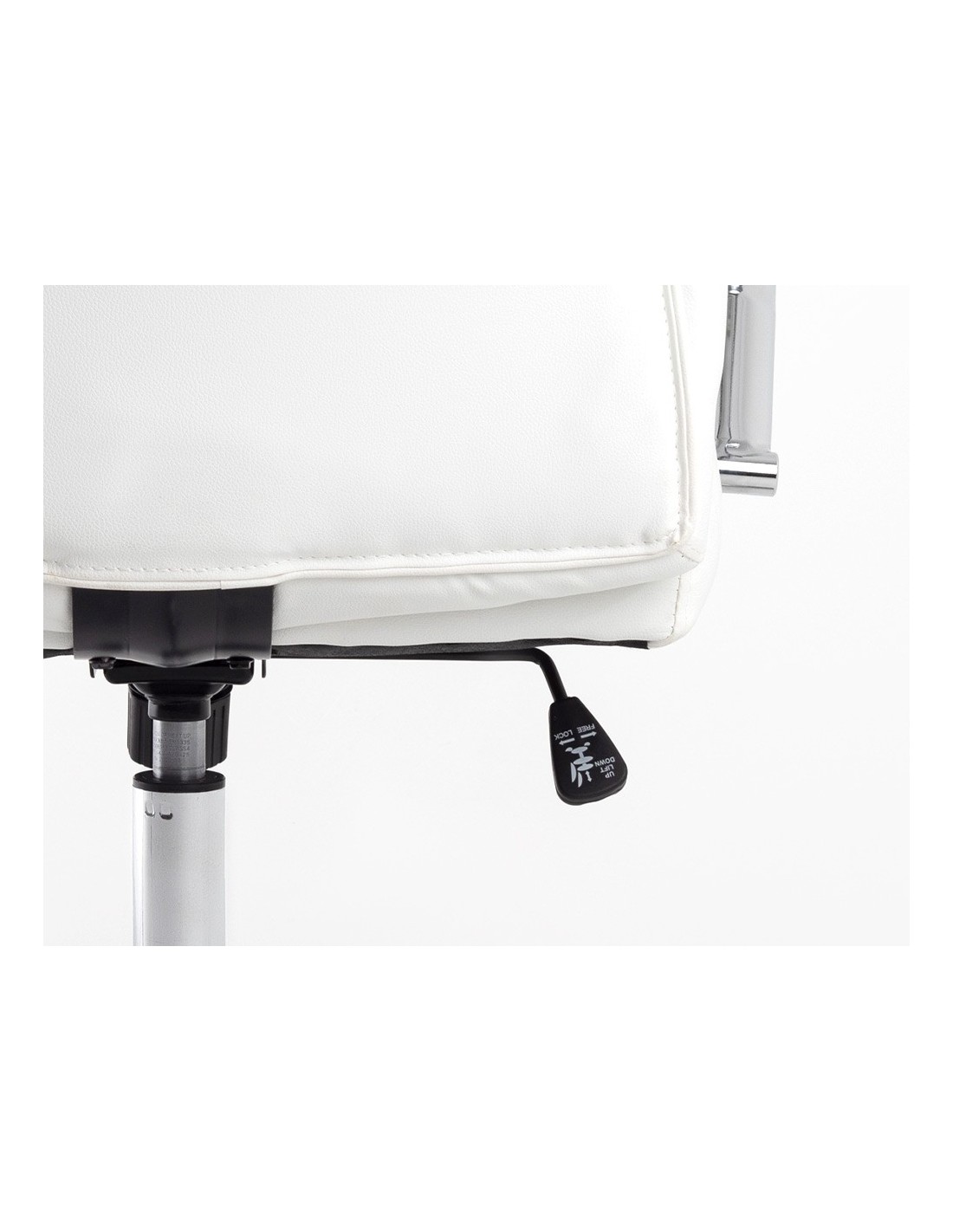 Silla de diseño con tapicería de simil piel en color blanco. Los reposabrazos de metal cromado añaden un toque de sofisticación a su diseño, al mismo tiempo que garantizan un soporte resistente y máximo confort gracias a su acolchado. Equipada con un mecanismo de mariposa, la silla ofrece opciones suaves y sin esfuerzo para reclinarse e inclinarse, permitiéndote encontrar la posición deseada. El pistón de gas cromado de 80 mm asegura un ajuste de altura sencillo, adaptándose a las preferencias de quien la use. Lasilla está construida con una base cromada resistente, garantizando estab ilidad y durabilidad. Equipada con ruedas premium, ofrece una movilidad suave, permitiéndote desplazarte sin esfuerzo por tu espacio de trabajo. Las ruedas están especialmente diseñadas con un recubrimiento de nylon que evita arañazos y protege el parqué u otras superficies delicadas. Con unas dimensiones óptimas, Ancho 63 cm x Profundidad 70 cm x Altura 116-124 cm, esta silla ofrece un amplio espacio pa