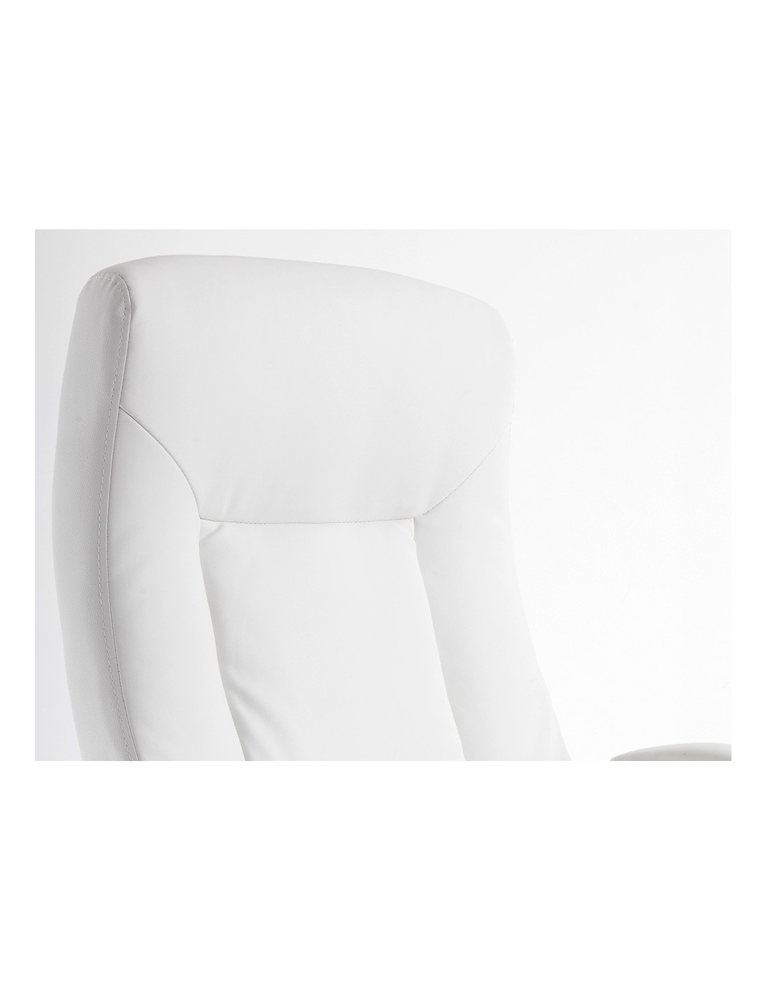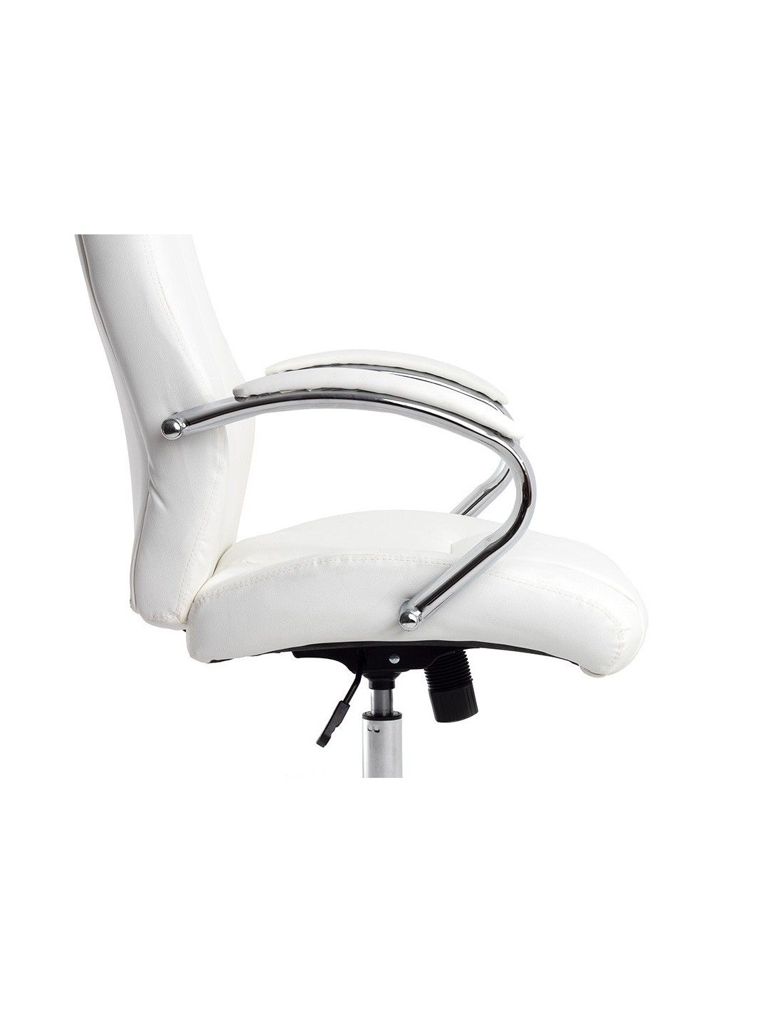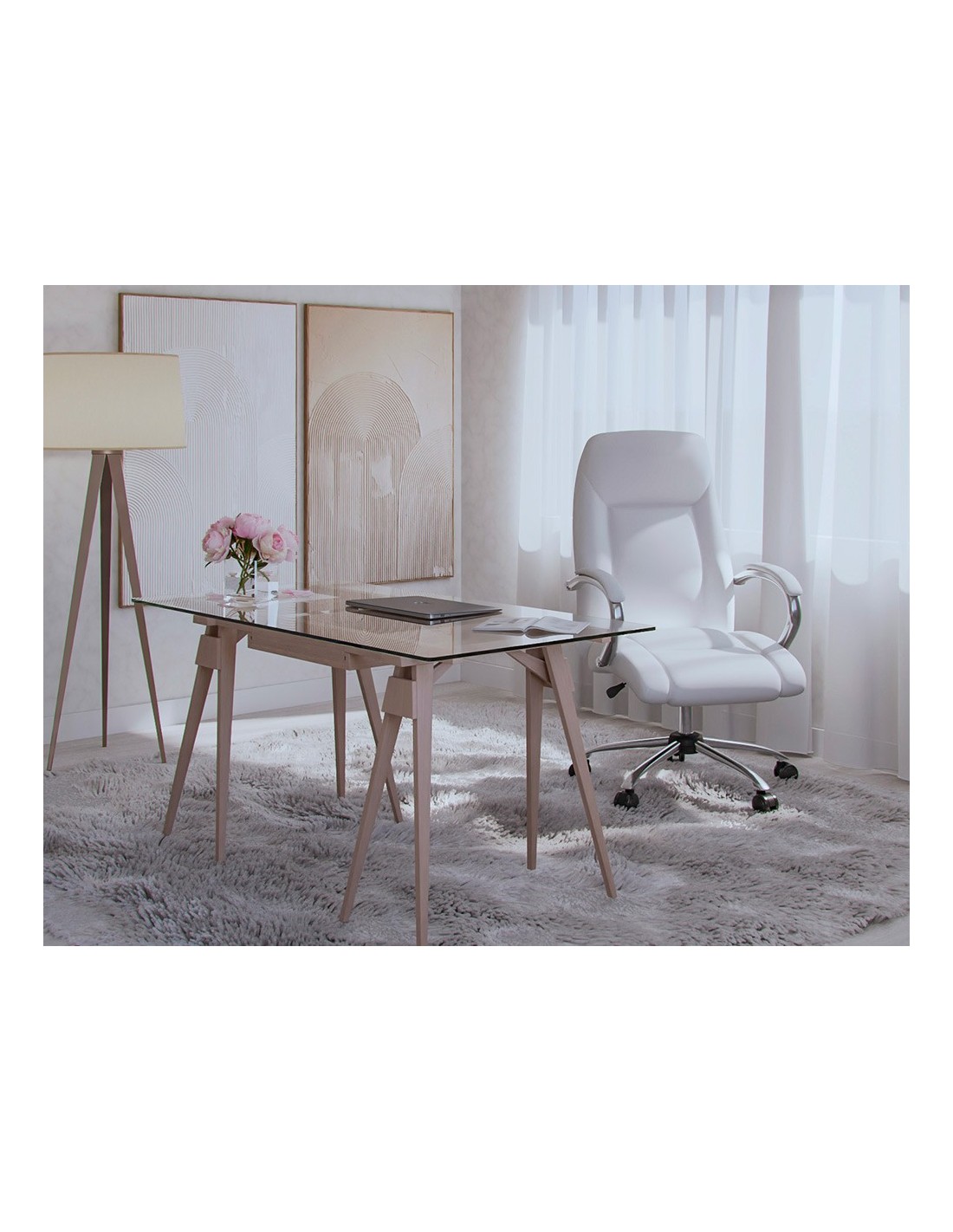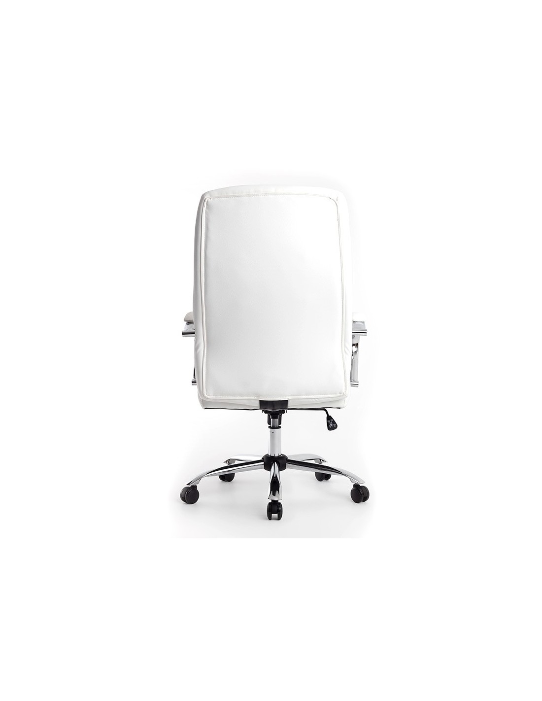 Silla de diseño con tapicería de simil piel en color blanco. Los reposabrazos de metal cromado añaden un toque de sofisticación a su diseño, al mismo tiempo que garantizan un soporte resistente y máximo confort gracias a su acolchado. Equipada con un mecanismo de mariposa, la silla ofrece opciones suaves y sin esfuerzo para reclinarse e inclinarse, permitiéndote encontrar la posición deseada. El pistón de gas cromado de 80 mm asegura un ajuste de altura sencillo, adaptándose a las preferencias de quien la use. Lasilla está construida con una base cromada resistente, garantizando estab ilidad y durabilidad. Equipada con ruedas premium, ofrece una movilidad suave, permitiéndote desplazarte sin esfuerzo por tu espacio de trabajo. Las ruedas están especialmente diseñadas con un recubrimiento de nylon que evita arañazos y protege el parqué u otras superficies delicadas. Con unas dimensiones óptimas, Ancho 63 cm x Profundidad 70 cm x Altura 116-124 cm, esta silla ofrece un amplio espacio pa