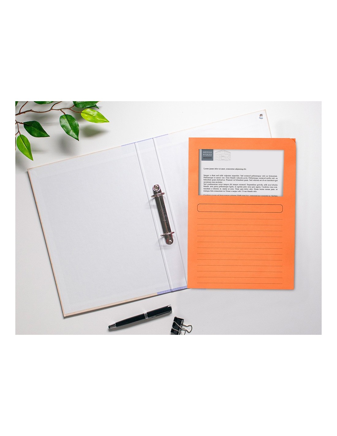 Fabricada en cartulina de 120 g/m². Tapa con ventana transparente. Formato DIN A4.