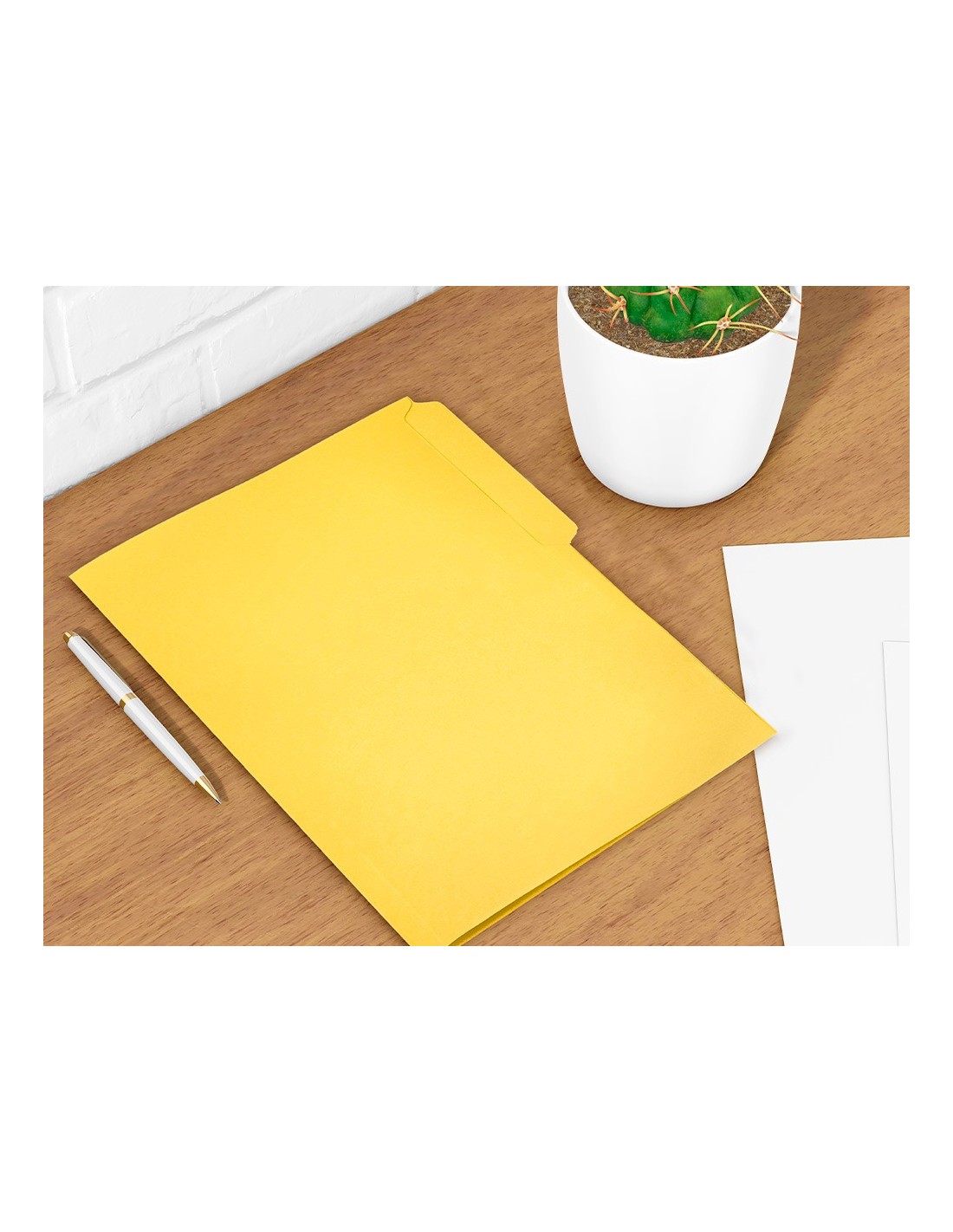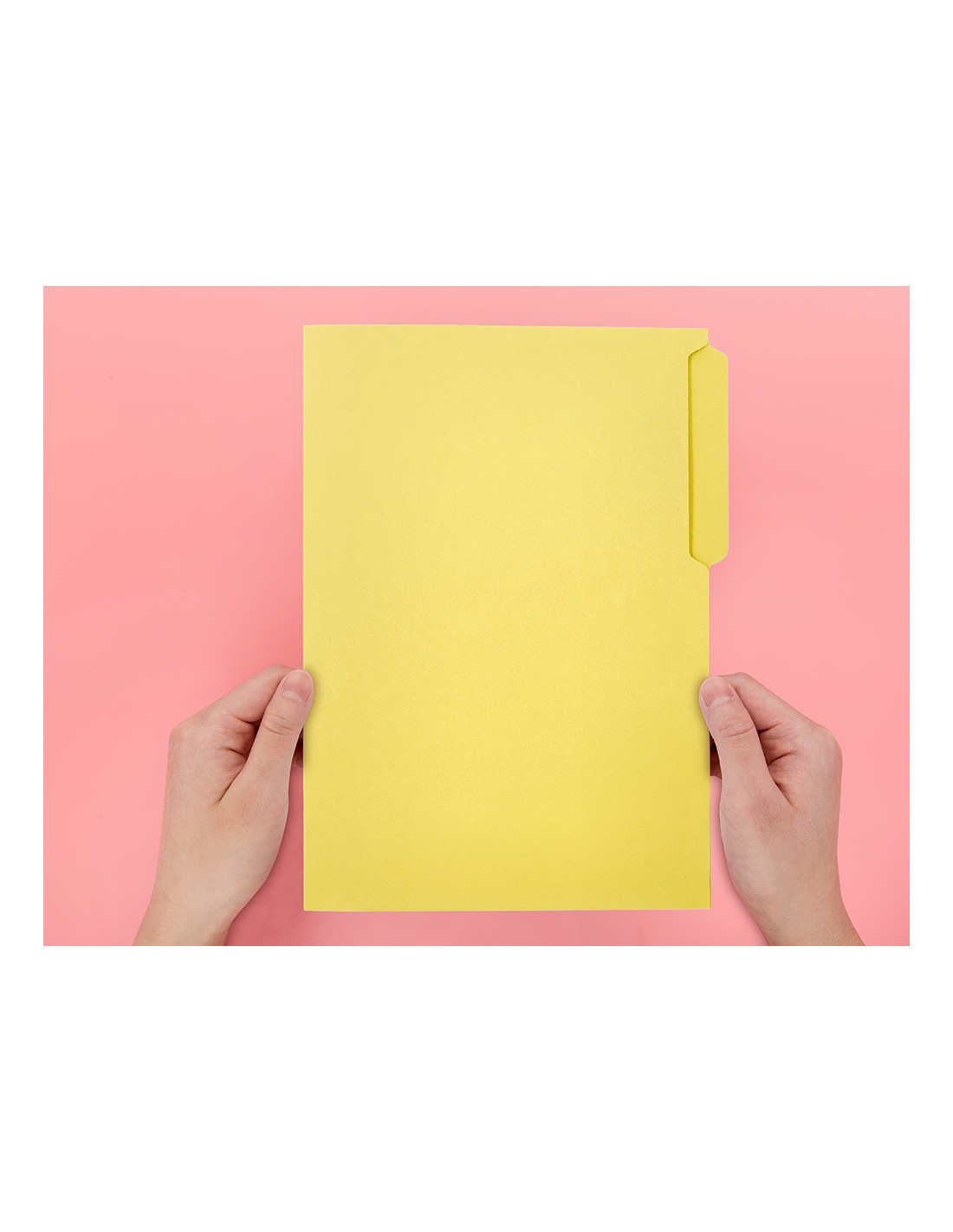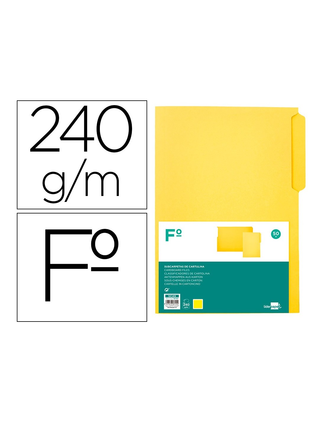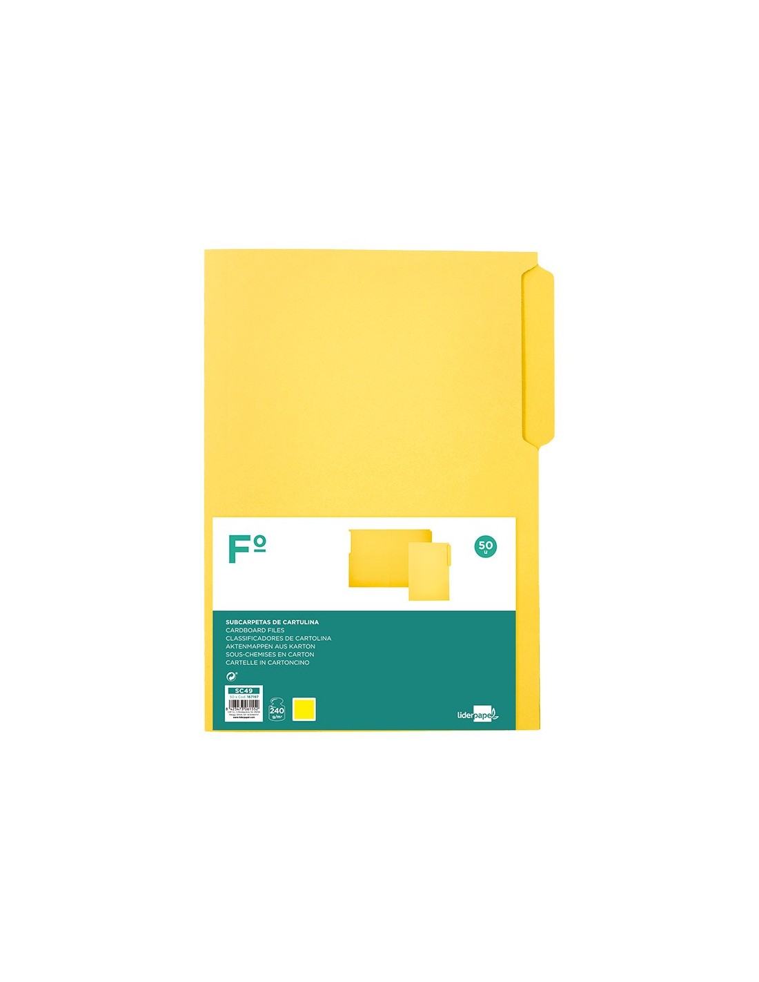 Subcarpeta con pestaña Liderpapel, ideal para subdividir información en carpetas colgantes. Pestaña escribible. Hendidos para incorporar fastener. Resistente para uso intensivo. Fabricada en cartulina de 240 g/m². Tamaño Folio. Color Amarillo