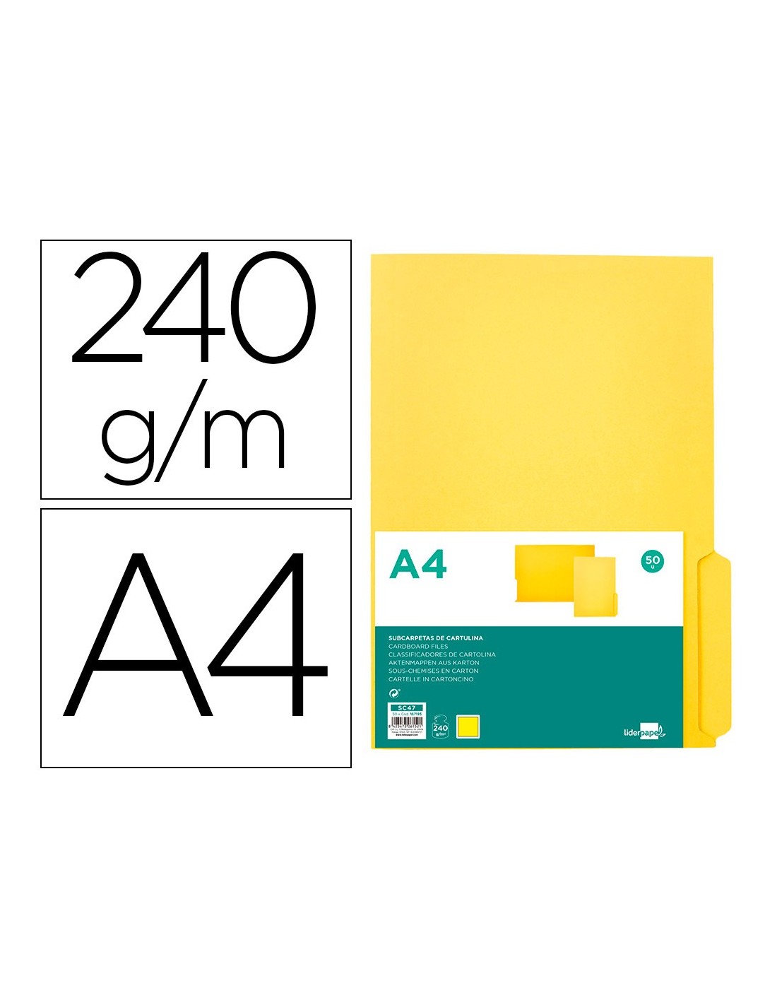 Subcarpeta con pestaña Liderpapel, ideal para subdividir información en carpetas colgantes. Pestaña escribible. Hendidos para incorporar fastener. Resistente para uso intensivo. Fabricada en cartulina de 240 g/m². Tamaño A4. Color Amarillo