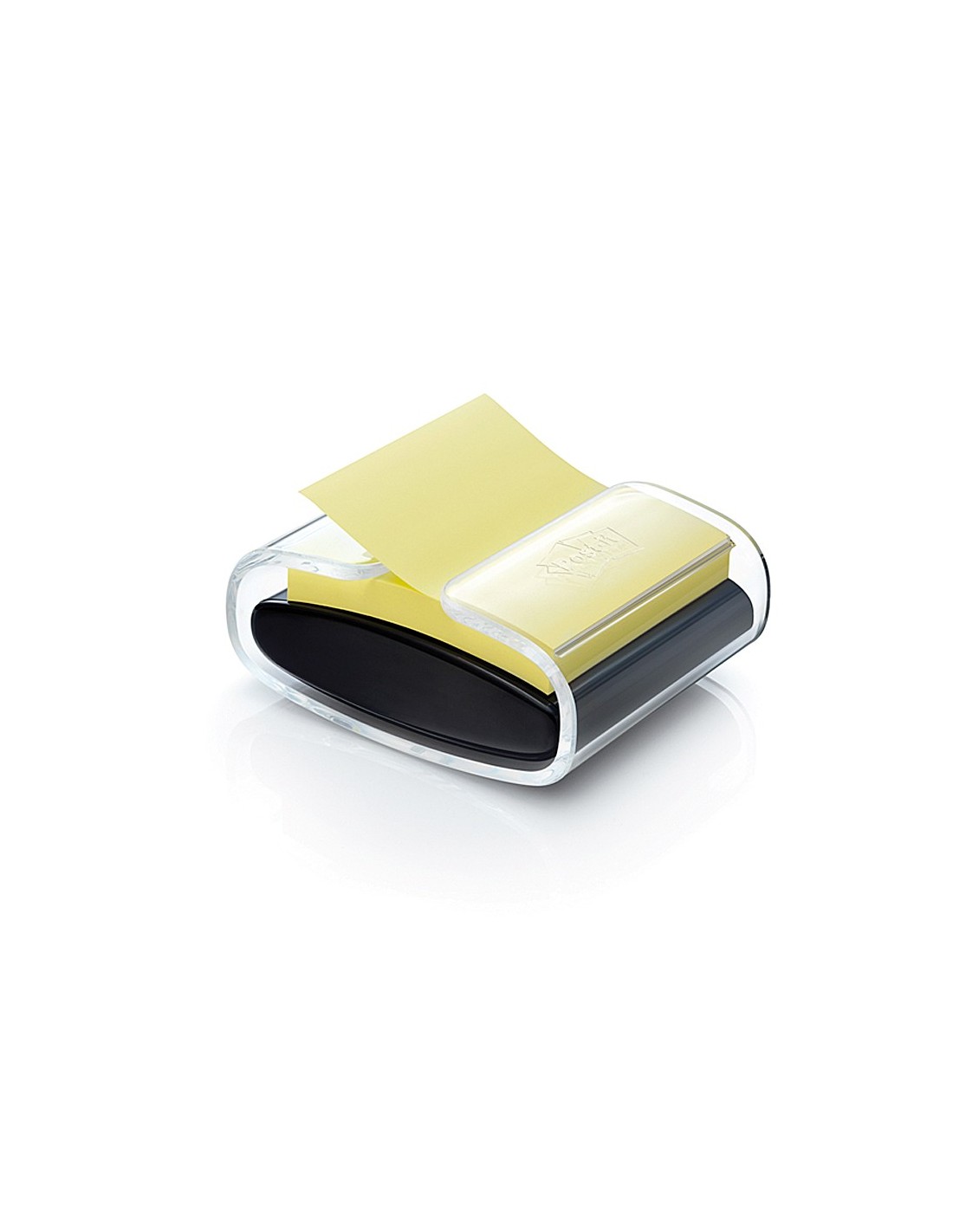 Dispensador con un diseño moderno y compacto. Formas suaves y redondeadas. Color negro / transparente. Incluye 1 bloc de 100 notas Super Sticky Z-Notes de 76 x 76 mm en color amarillo.