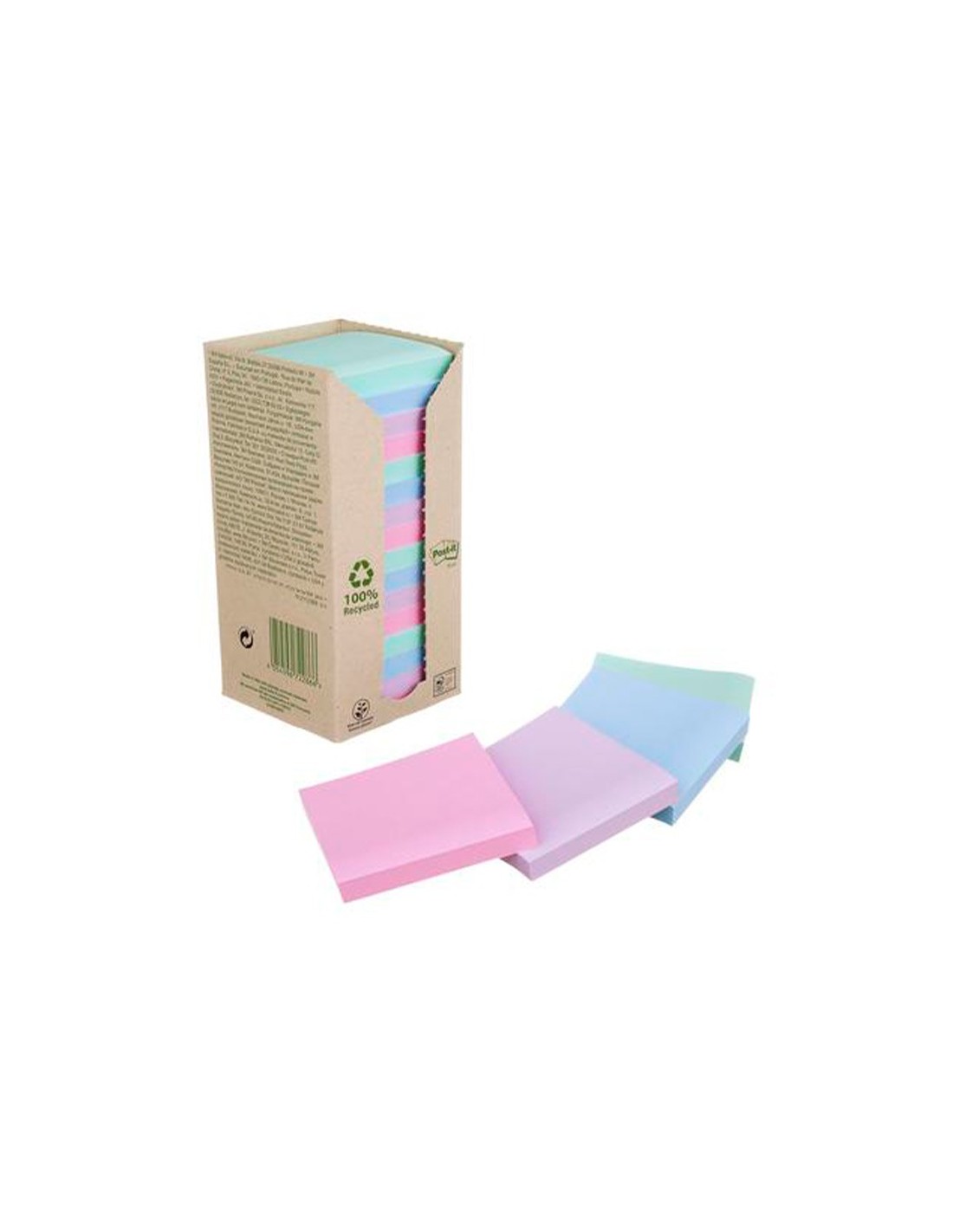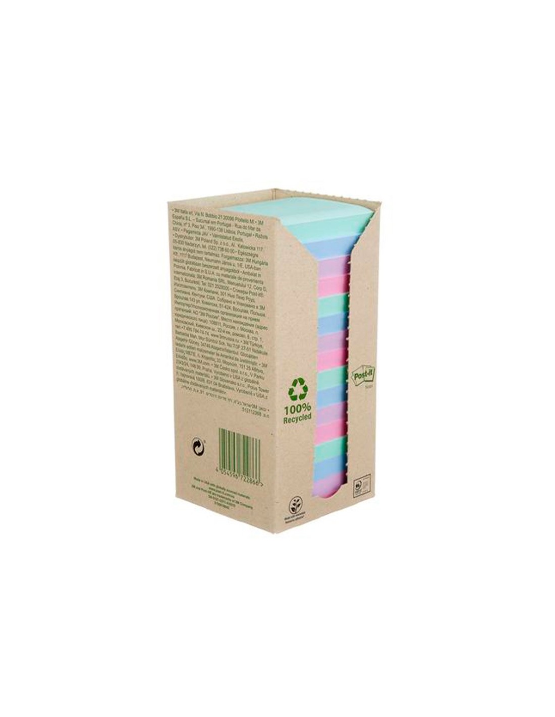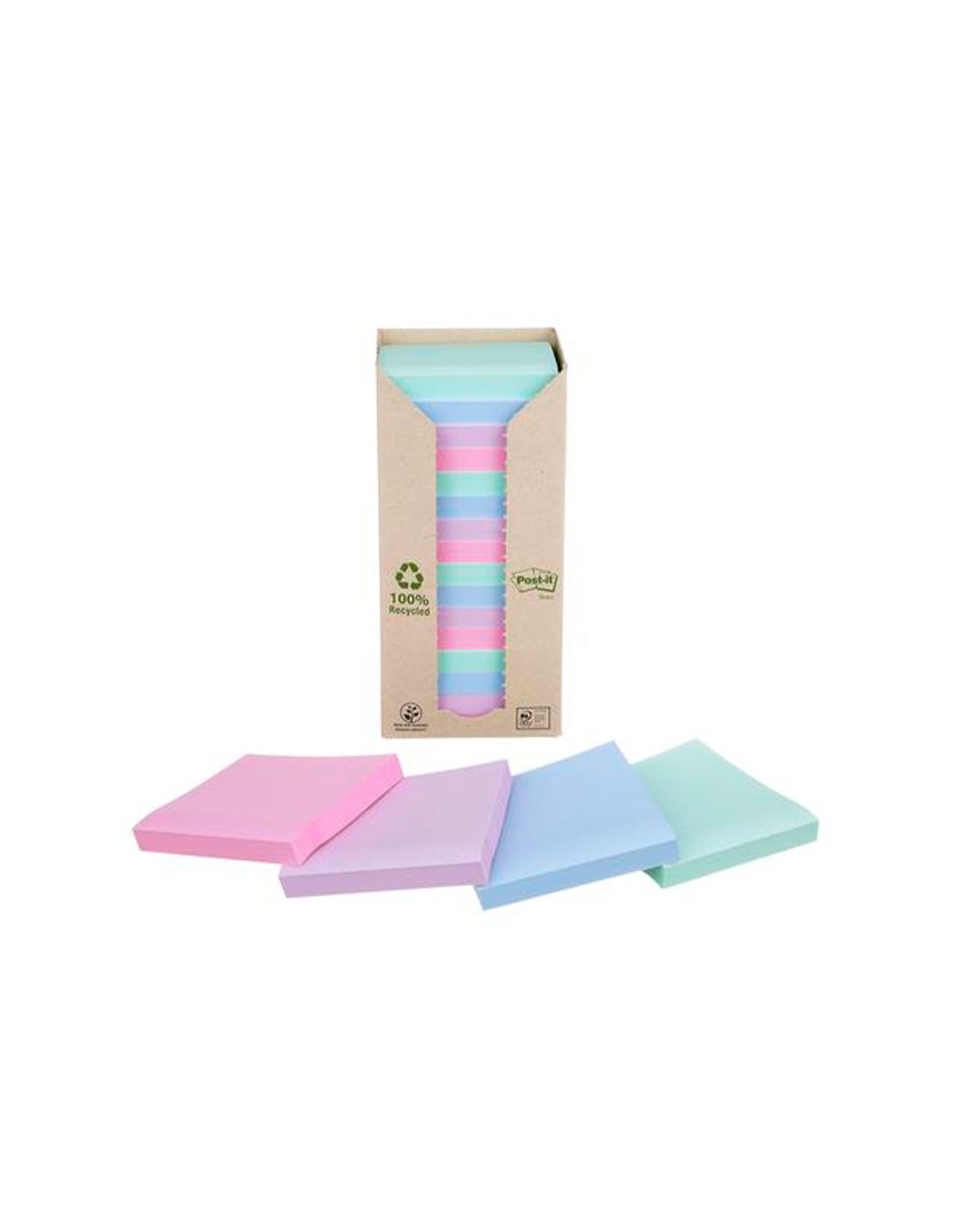 Las notas recicladas Post-it están fabricadas 100 % con fibras de papel reciclado y un adhesivo de fuentes renovables, fabricado al 60 % con plantasque vuelven a crecer cada año. Tienen la certificación PEFC RECYCLED, se obtienen de bosques certificados, renovables y gestionados responsablemente. Torre con 16 blocs. 100 hojas. Colores surtidos. Medidas: 76x76 mm.