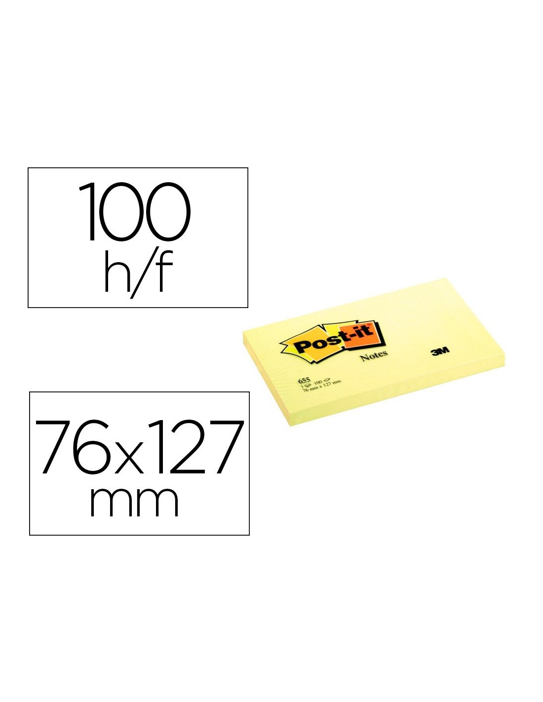 Bloc de notas adhesivas quita y pon post-it 76x127 mm con 100 hojas. Retractilados individualmente. Recomendables para escribir datos. Color amarillo canario. Las notas Post-it están elaboradas con fibras de papel con certificación PEFC procedentes de explotaciones sostenibles y orígenes controlados. El embalaje está hecho de cartón reciclado y puede usarse para guardar fácilmente las notas adhesivas y se puede reciclar cuando ya no se necesite.
