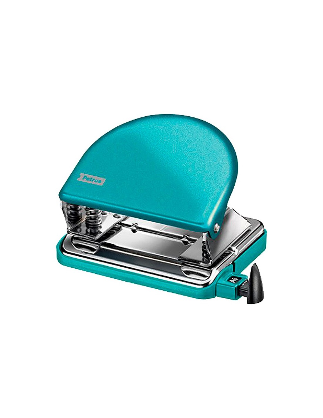 Taladrador completamente metálico. Capacidad de taladro hasta 20 hojas. Punzones más afilados que permiten taladrar con menos esfuerzo. Regleta tope con formatos impresos y ventana para mayor visibilidad y mejor fijación. Cubeta de plástico EVA de gran durabilidad. Garantía de 10 años. Medidas de la base: 140 x 94 mm.