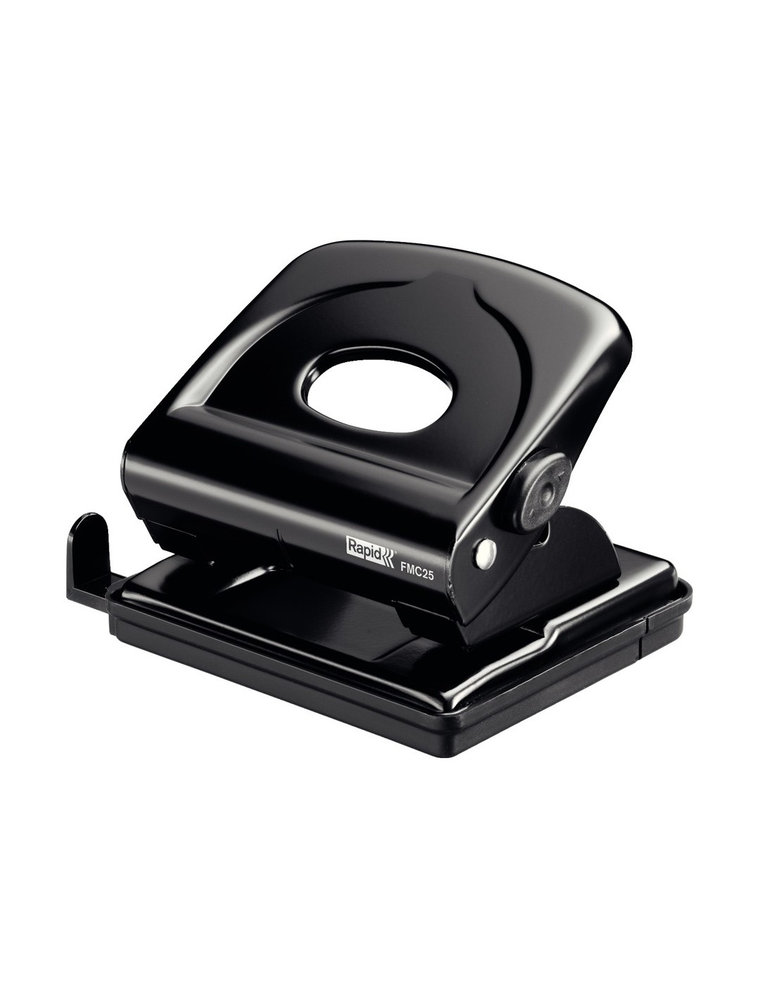 Resistente taladro de metal con bloqueo de la palanca para que ocupe menos espacio. Ideal para uso de oficina. Diámetro de punzones: 5,5 mm. Capacidad de perforado: 25 hojas. Color negro. Medidas de la base: 115 x 102 mm.