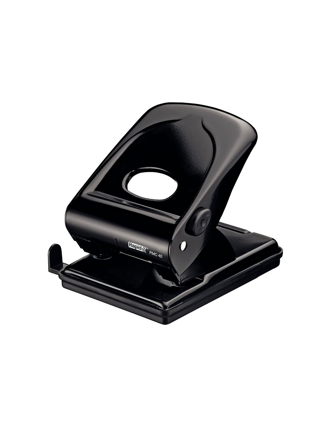 Potente taladro de metal equipado con bloqueo de la palanca para facilitar su almacenamiento. Tiene regleta tope para alinear el papel. Ideal para uso de oficina. Diámetro de punzones: 5,5 mm. Capacidad de perforado: 40 hojas. Color negro. Medidas de la base: 69 x 115 mm.