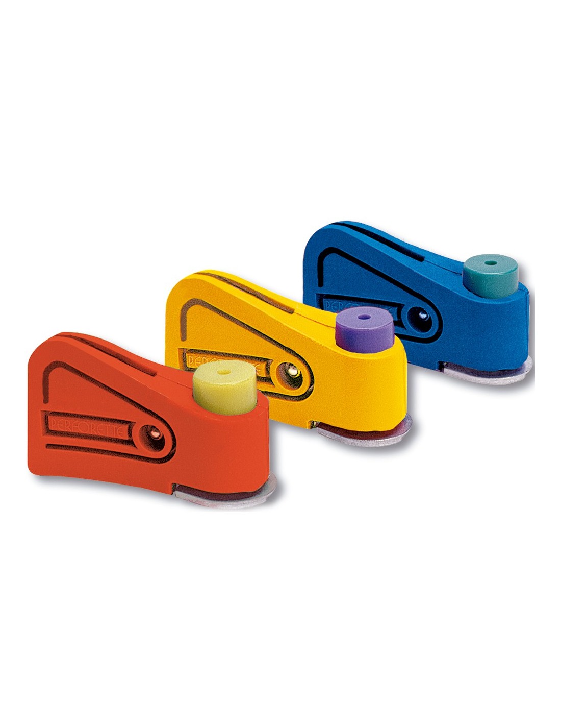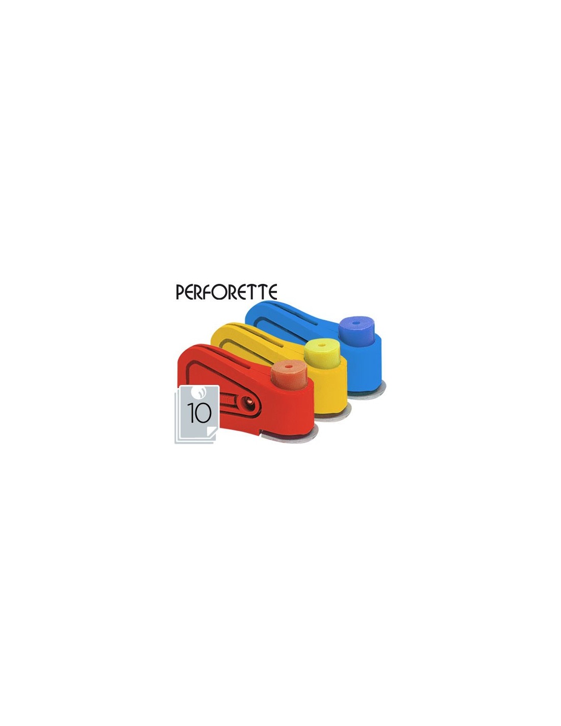 Perforador con cuerpo de plástico y punzón de metal. Práctico sistema que perfora en el lugar exacto. Longitud de la base: 65 mm.