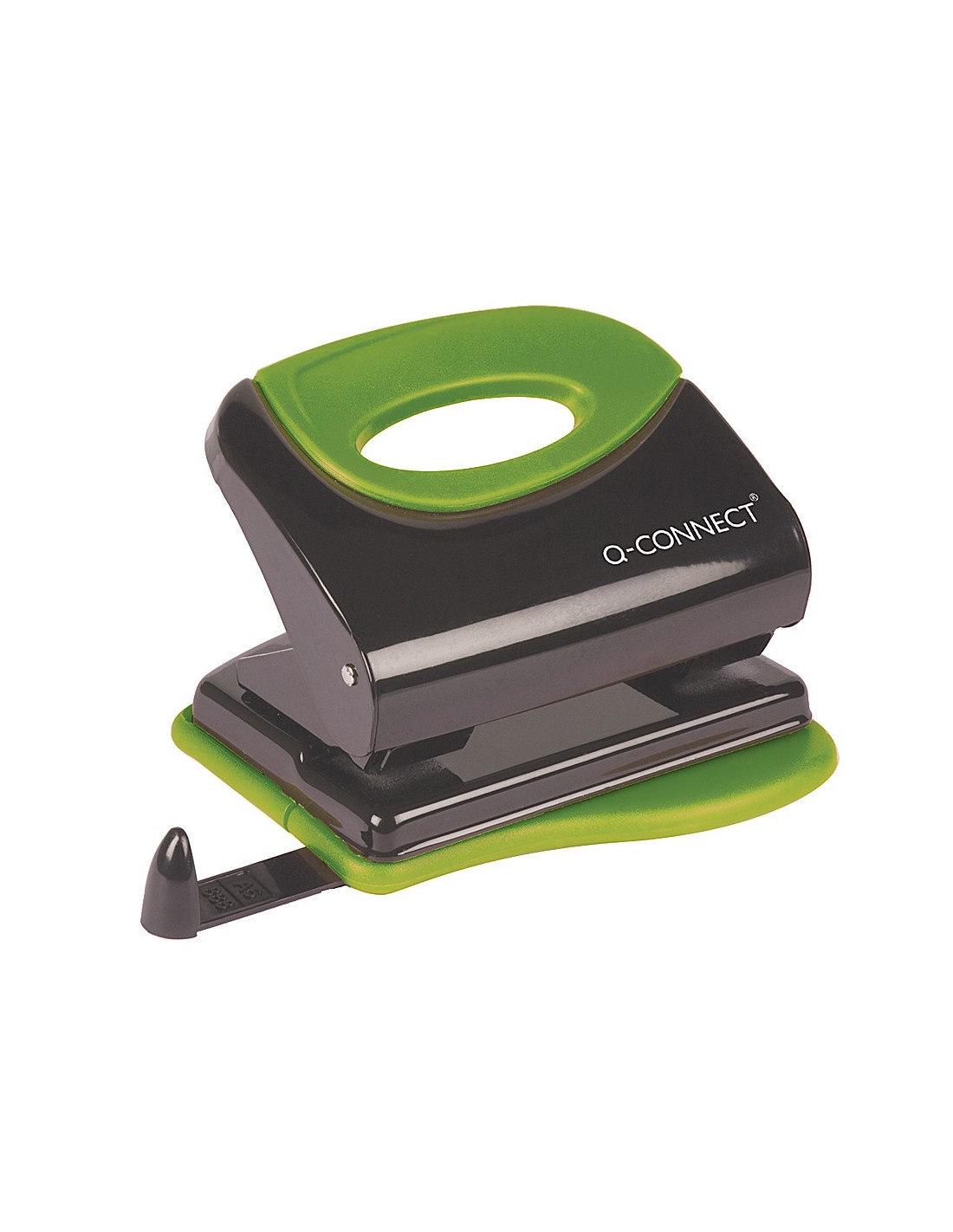 Taladrador metálico con empuñadura verde de caucho antideslizante. Con regleta tope para alinear el papel. Diseño en atractivos colores. Medidas de la base: 117 x 105 mm.