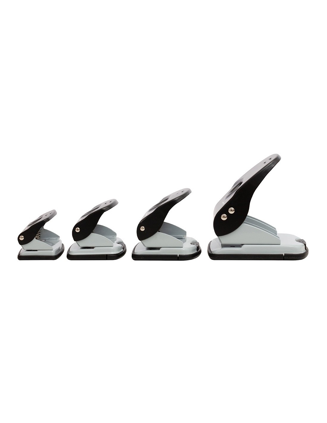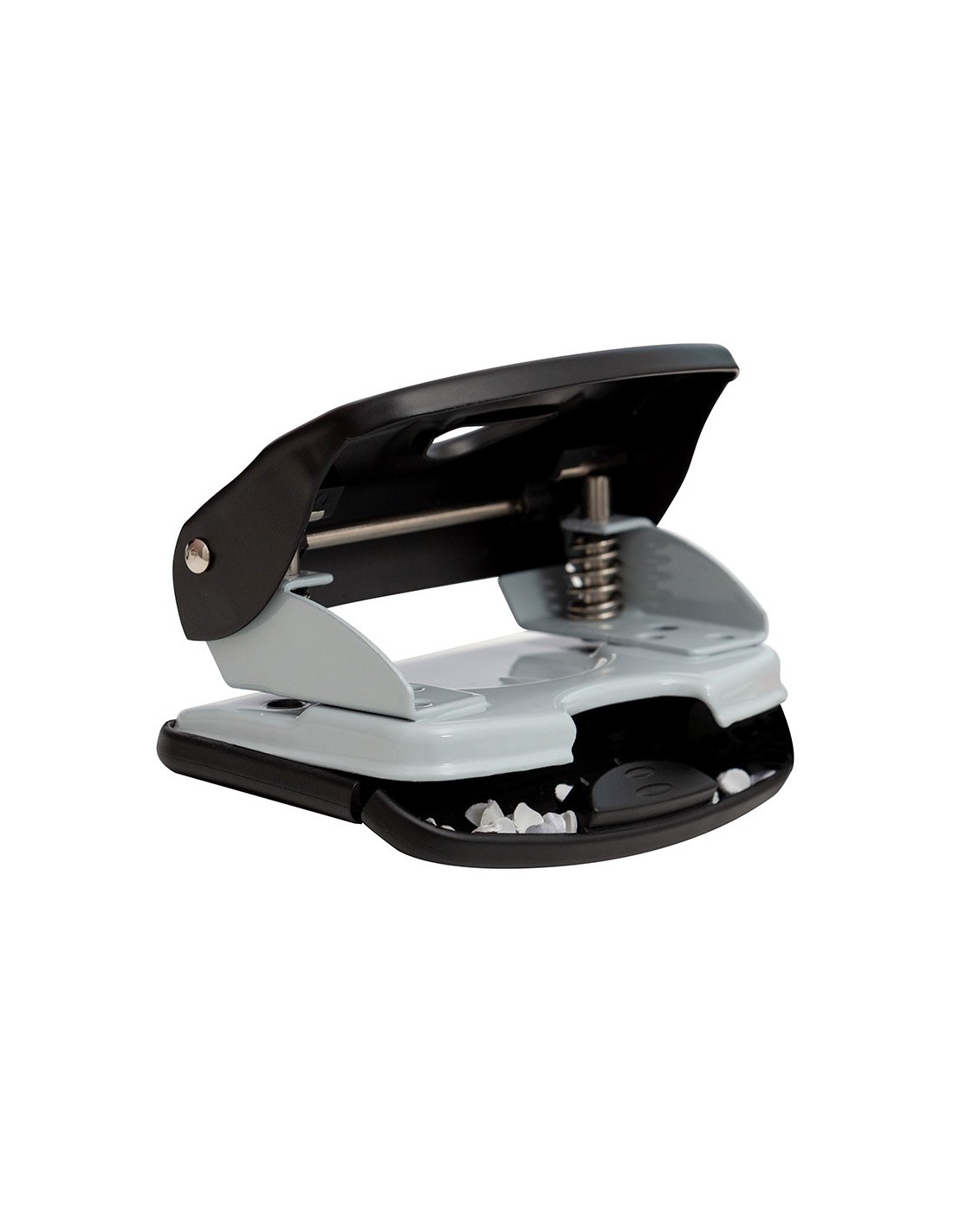Parte superior de plástico y base metálica, con base antideslizante de plástico. Capacidad para taladrar 40 hojas. Apertura de 4 mm. Dispone de regleta tope para alinear el papel. Color negro. Medidas de la base: 140 x 130mm.