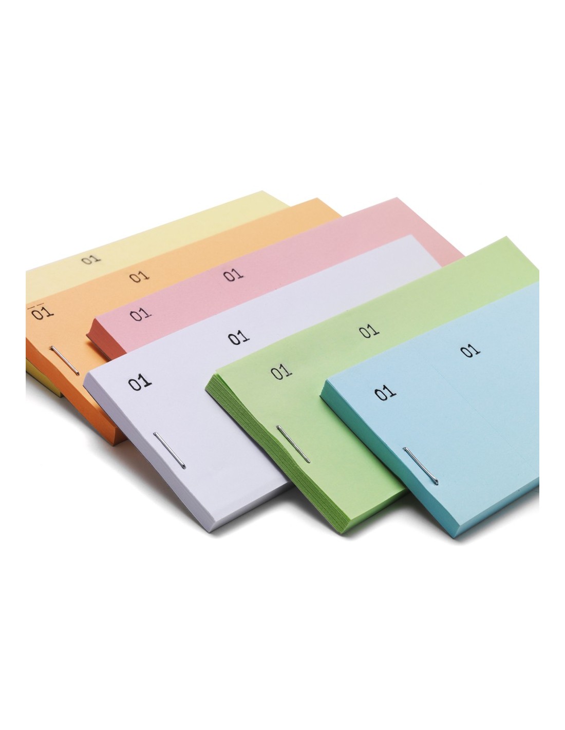 Tapa de cartoncillo. Grapado. Con matriz y numerados. 100 hojas. Disponible en varios colores. Medidas: 145 x 60 mm.
