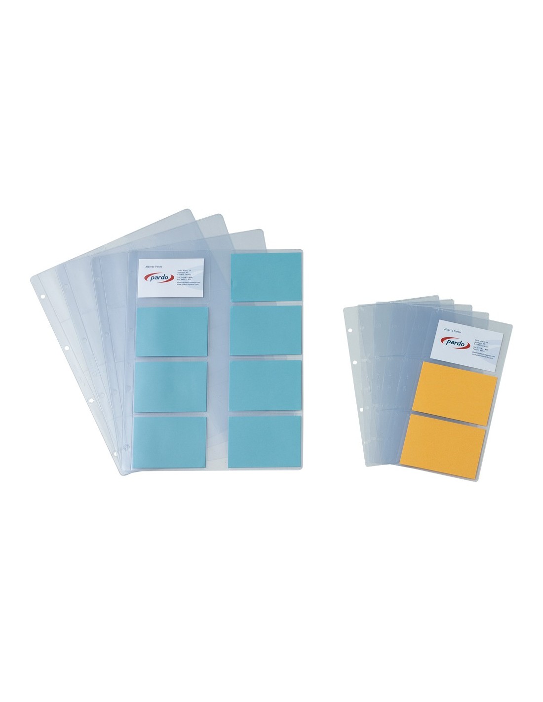 Tarjetero acolchado símil piel. Mecanismo de 4 anillas de 25 mm. Con 20 fundas. Capacidad para 320 tarjetas de visita. Incluye índice alfabético. Exterior en color negro e interior en rojo. Tamaño folio. Medidas: 290 x 360 mm.