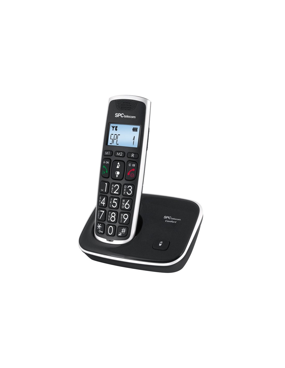 Agenda con 20 nombres. Pantalla iluminada en color azul. Teclas grandes y dígitos grandes en pantalla. Bloqueo de teclado. Teclado sonoro con posibilidad de cambiar el nivel de sonido. 10 melodías de timbre, y timbre distintivo entre llamada interna y externa. Tecla R configurable. Manos libres. Identificación de llamada. Llamada en espera. La base puede soportar hasta 5 portátiles. Transferencia de llamada. Llamadas internas y llamada a tres. Idioma seleccionable. Compatible con audífonos en posición T. Amplificación extra del volumen del auricular de +10dB. Modo ECO. Color negro. Medidas: 177 x 57 x 27 mm. Peso: 156 g.