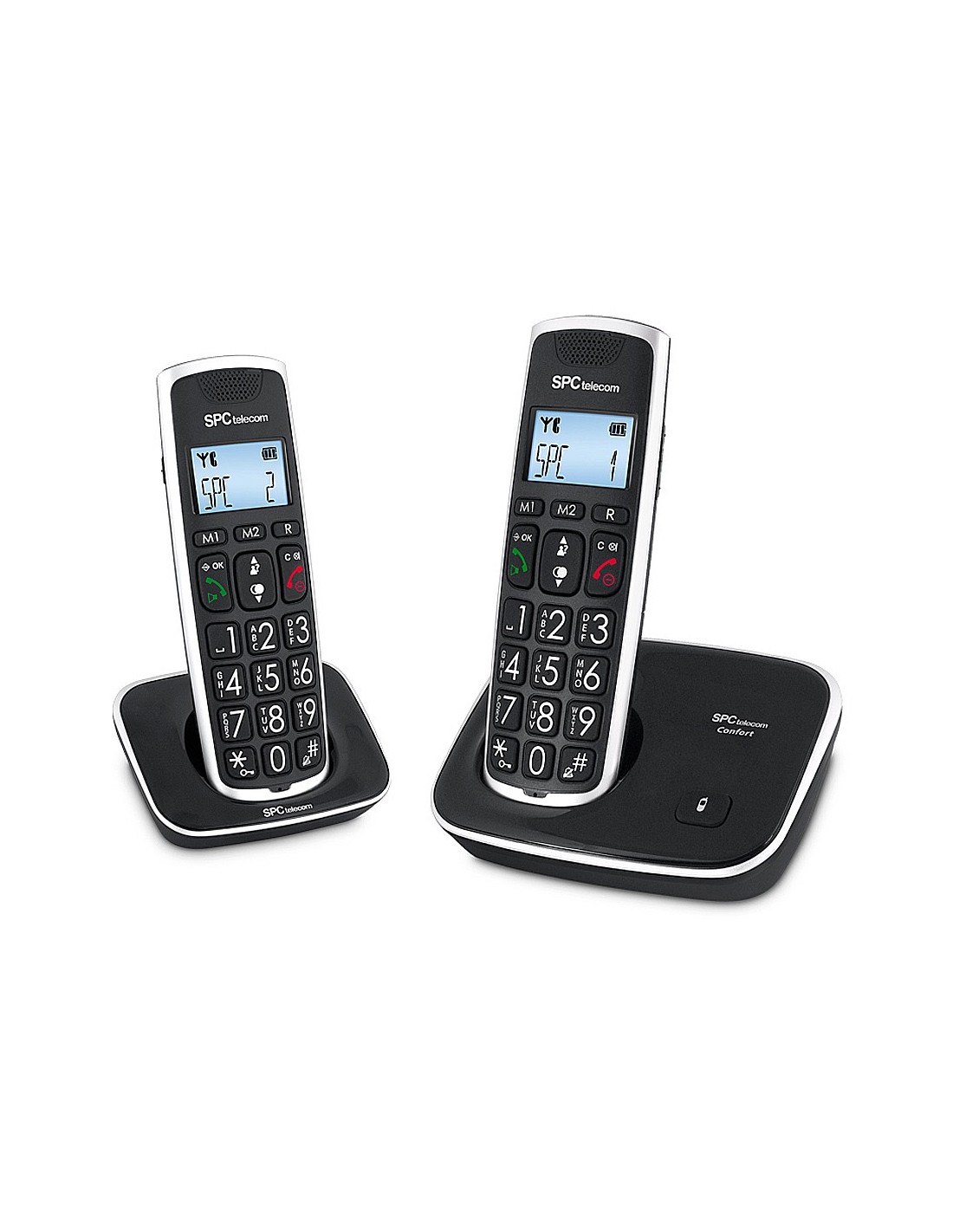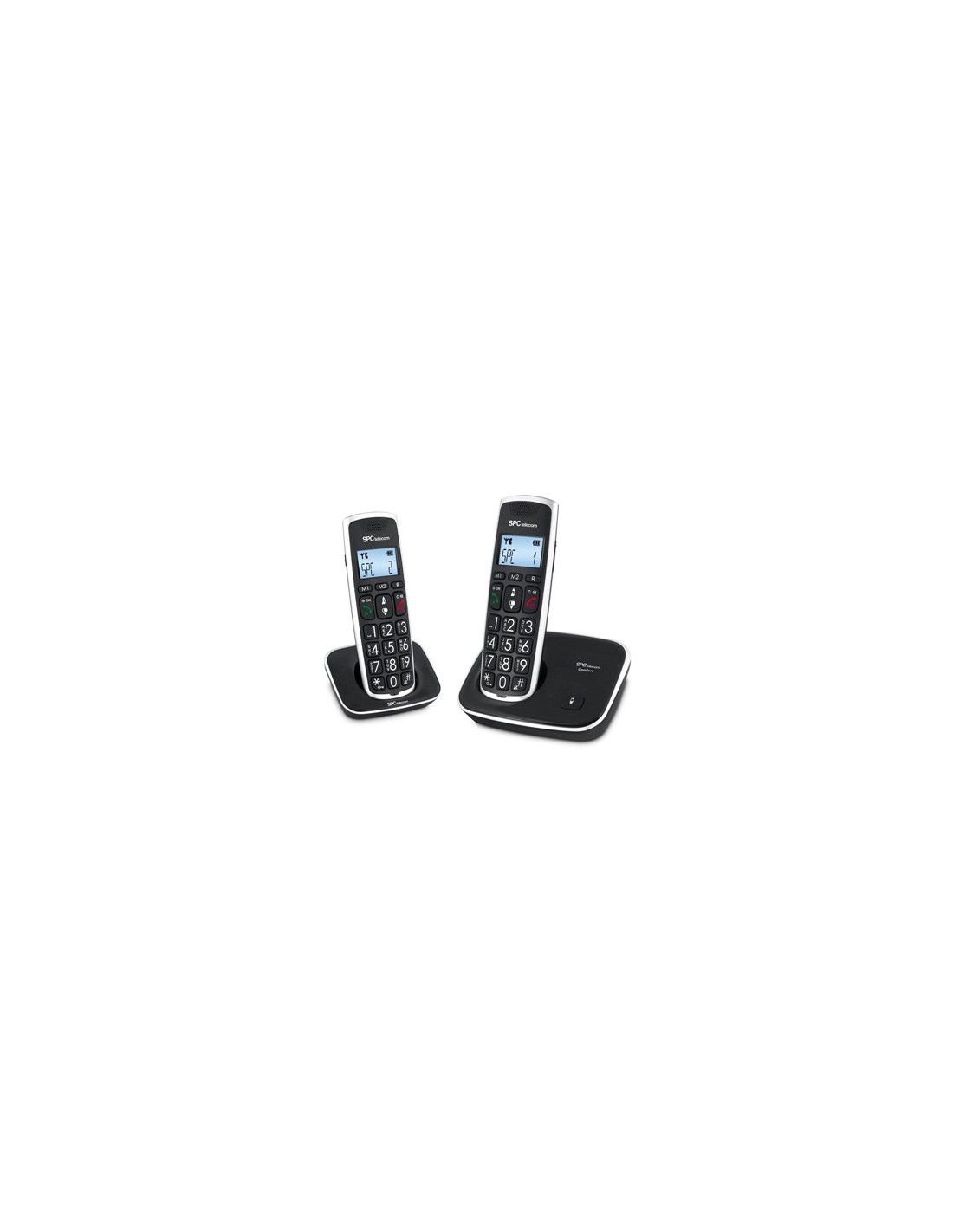 Teléfono inalámbrico Duo. Muy cómodo, gracias a su pantalla y teclas grandes. Elegante acabado negro piano de alto brillo. Ultima tecnología, incorpora estándar de transmisión DECT digital que garantiza la claridad y privacidad de tus conversaciones.Tecnología ECO que reduce el consumo de energía y la radiación. Incluye: Agenda de 60 nombres y números, más dos memorias directas, identificación de llamadas, manos libres, pantalla iluminada de gran tamaño y teclas grandes. Amplificación extra del volumen del auricular de +10dB. Compatible con audífonos. Con 10 melodías disponibles. Color negro. Medidas: 177 x 57 x 27 mm. Peso: 156 g.