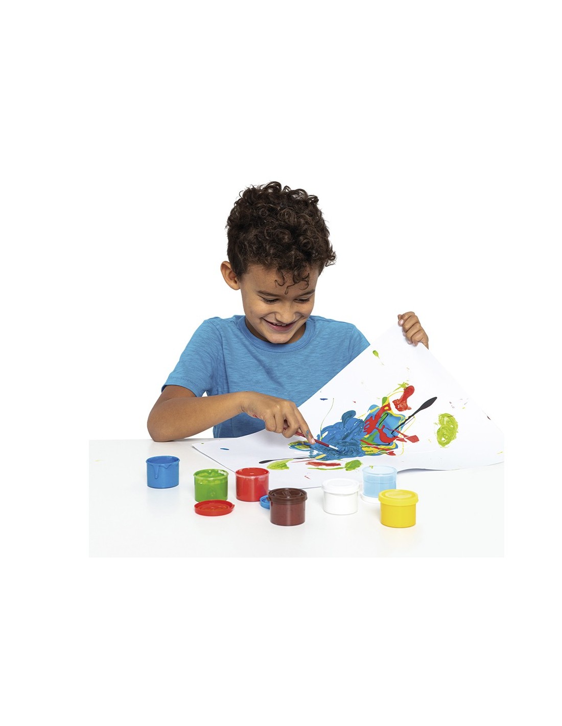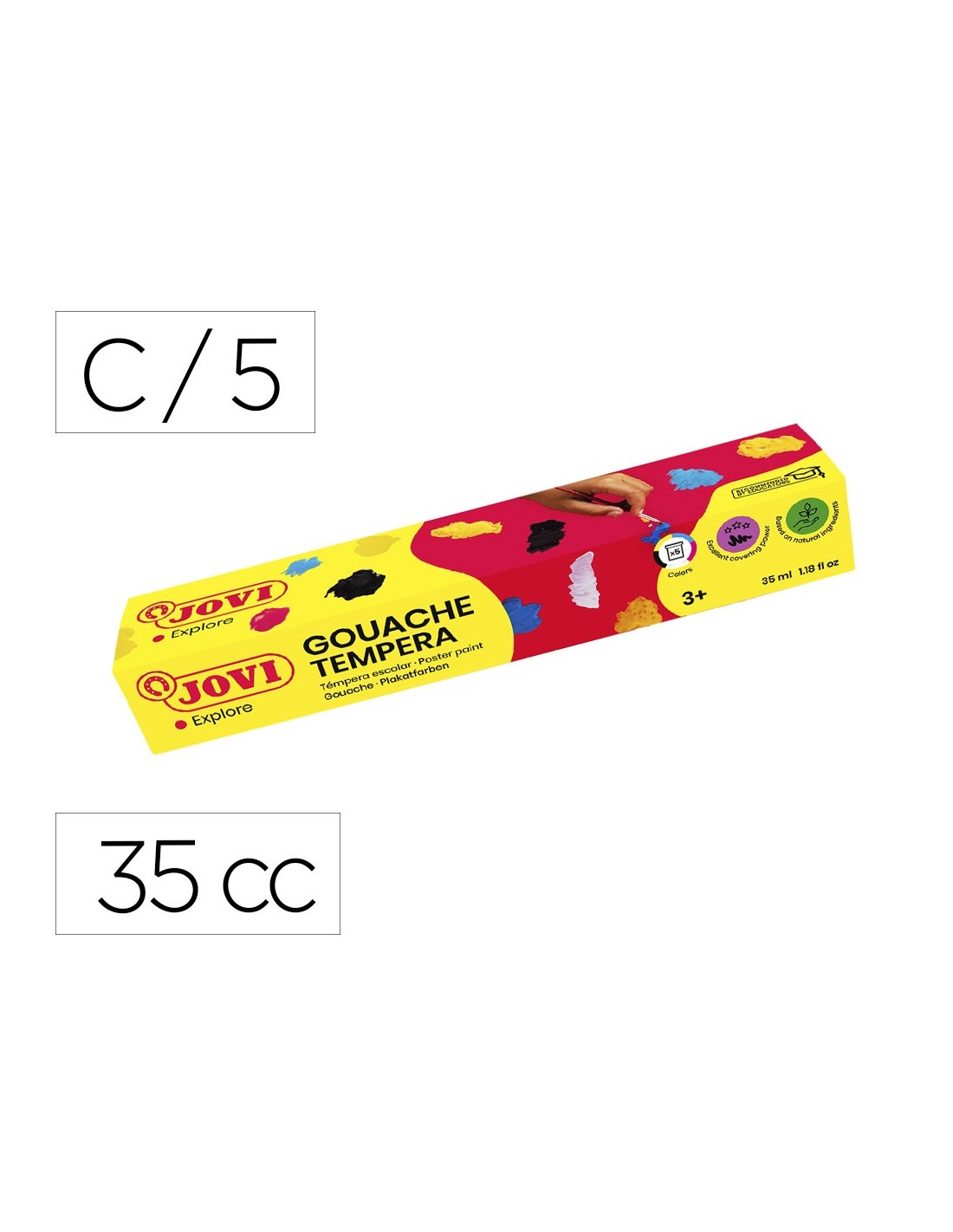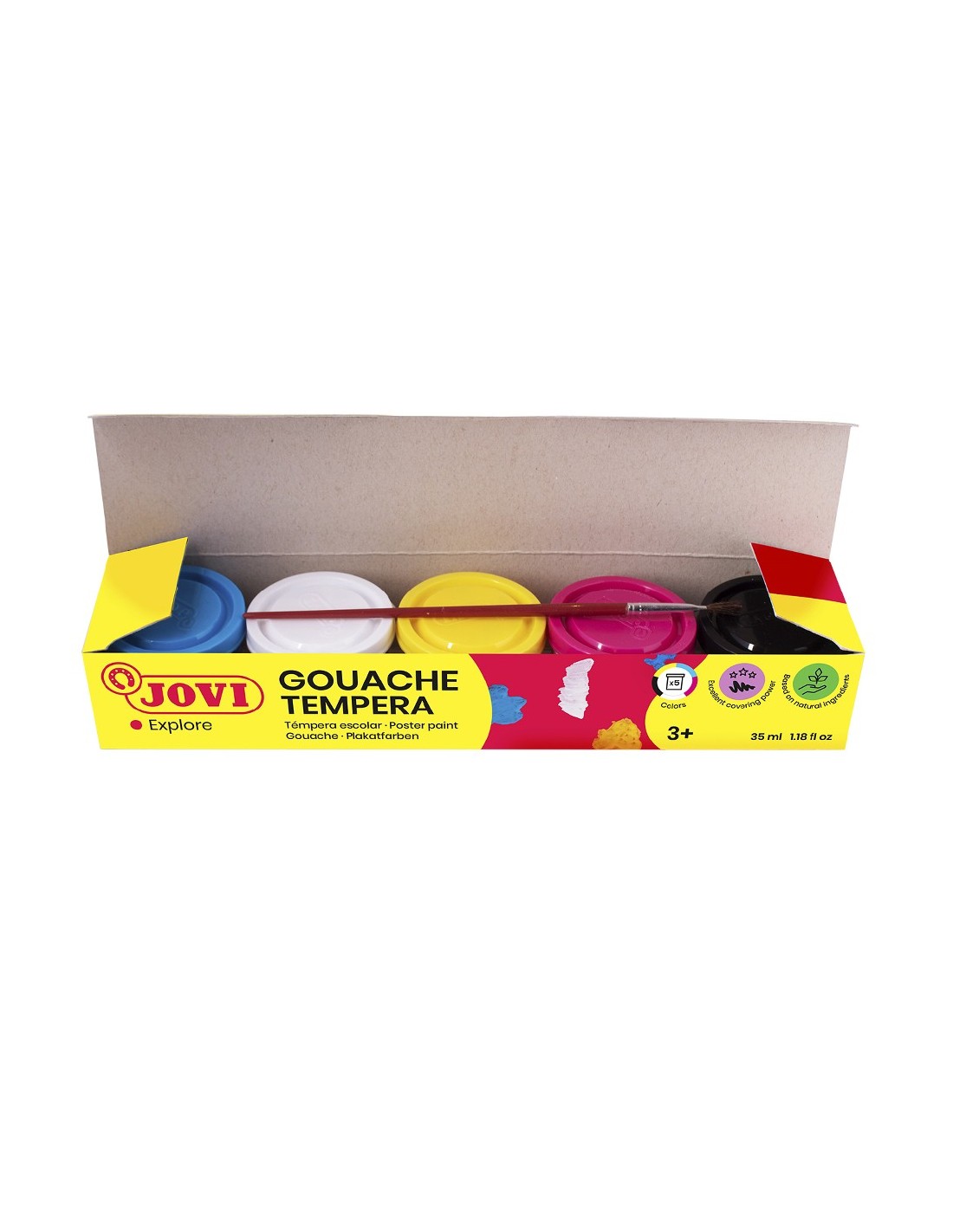 Para uso escolar. Pintura al agua. Ideal para utilizar sobre papel, cartulina, madera, tela, pasta de modelar y arcilla. La témpera Jovi es muy fluida, rinde mucho y cubre perfectamente. Secado rápido. Incluye pincel. 5 colores surtidos: amarillo, blanco, cian, magenta y negro.