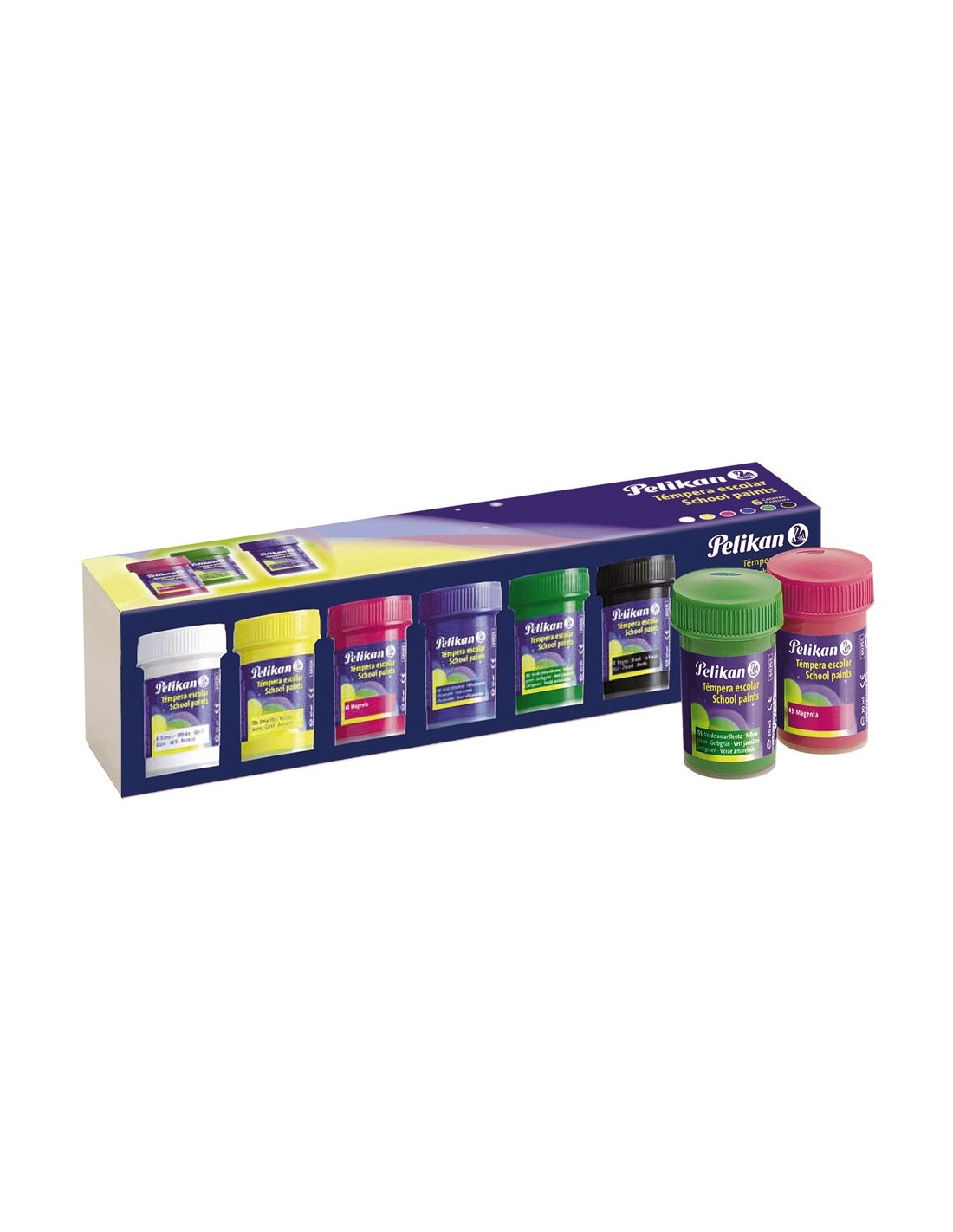 Témpera para uso escolar. Alto porcentaje de pigmentación. Diluibles en agua. Se pueden mezclar entre sí. Ideal para utilizar en papel, cartulina, madera, tela, pasta para modelar y arcilla. 6 colores surtidos: amarillo, blanco, cian, magenta, negro y verde.