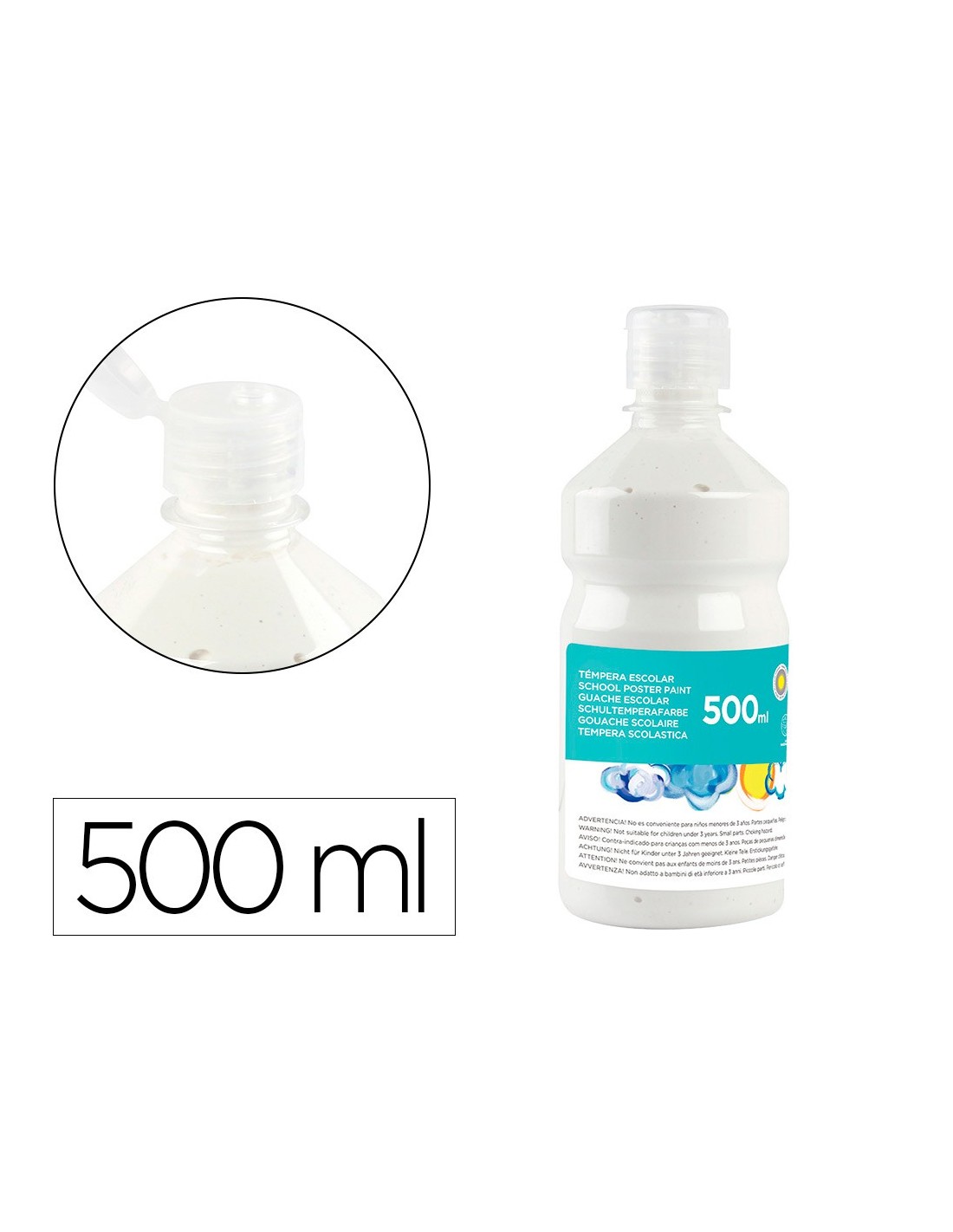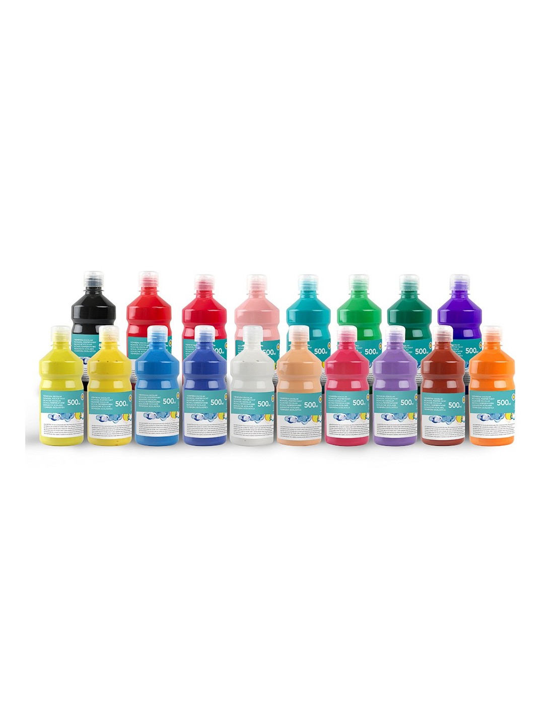 Témpera escolar. Ideal para uso escolar. Adecuada a partir de los 3 años de edad. Superlavable. Con cierre de seguridad. Colores brillantes. La botella de 500 ml.