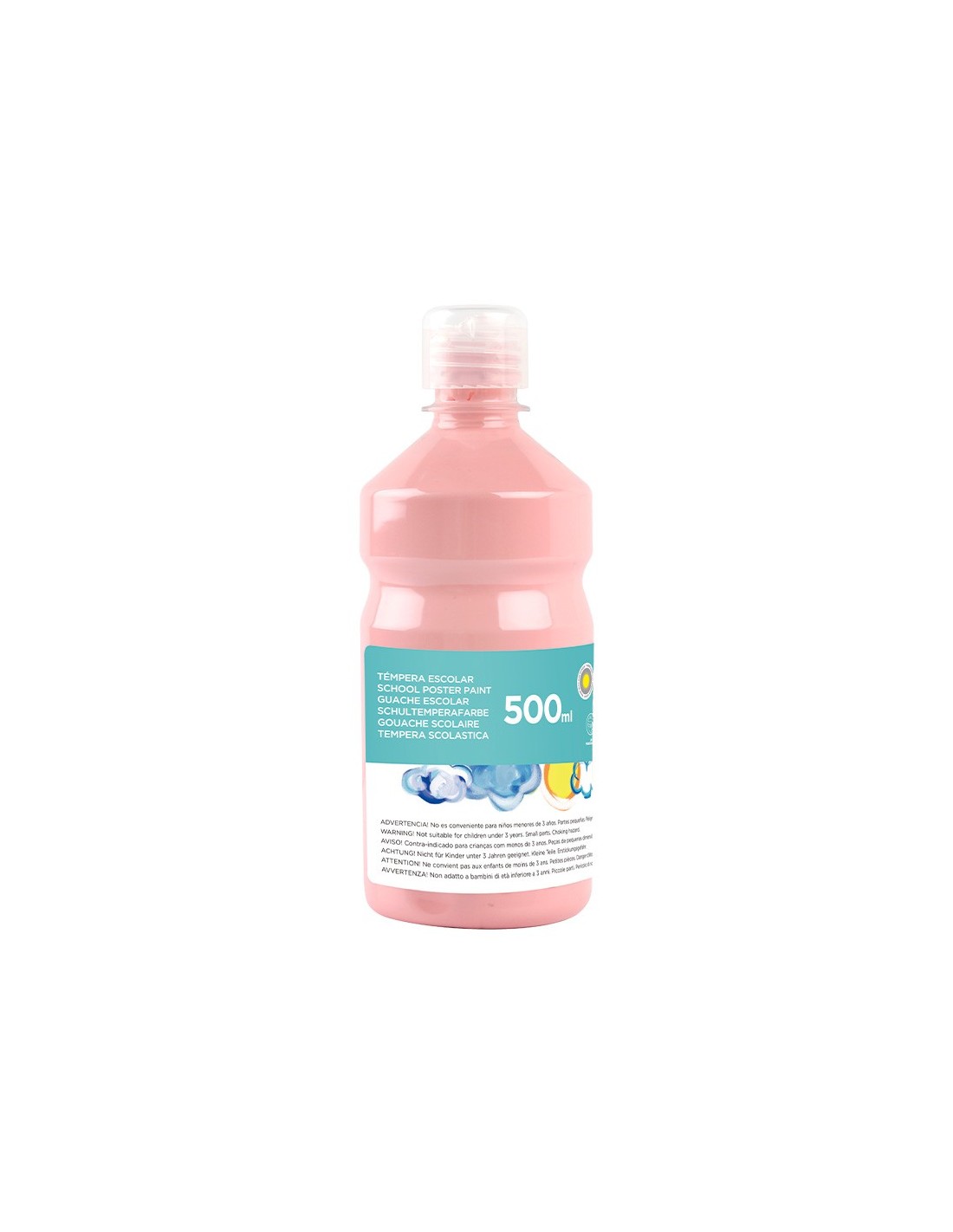 Témpera escolar. Ideal para uso escolar. Adecuada a partir de los 3 años de edad. Superlavable. Con cierre de seguridad. Colores brillantes. La botella de 500 ml.