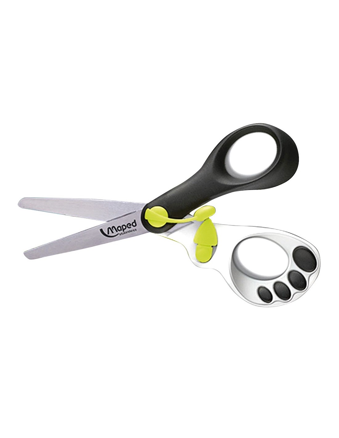 Apertura automática y resorte para facilitar la acción de corte. Puntas redondeadas y mango de plástico. Existe la posibilidad de anular el sistema para conseguir una utilización normal de la tijera. Longitud: 13 cm.