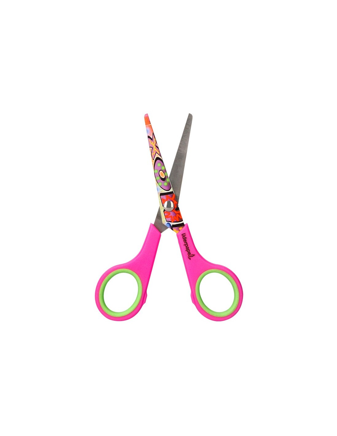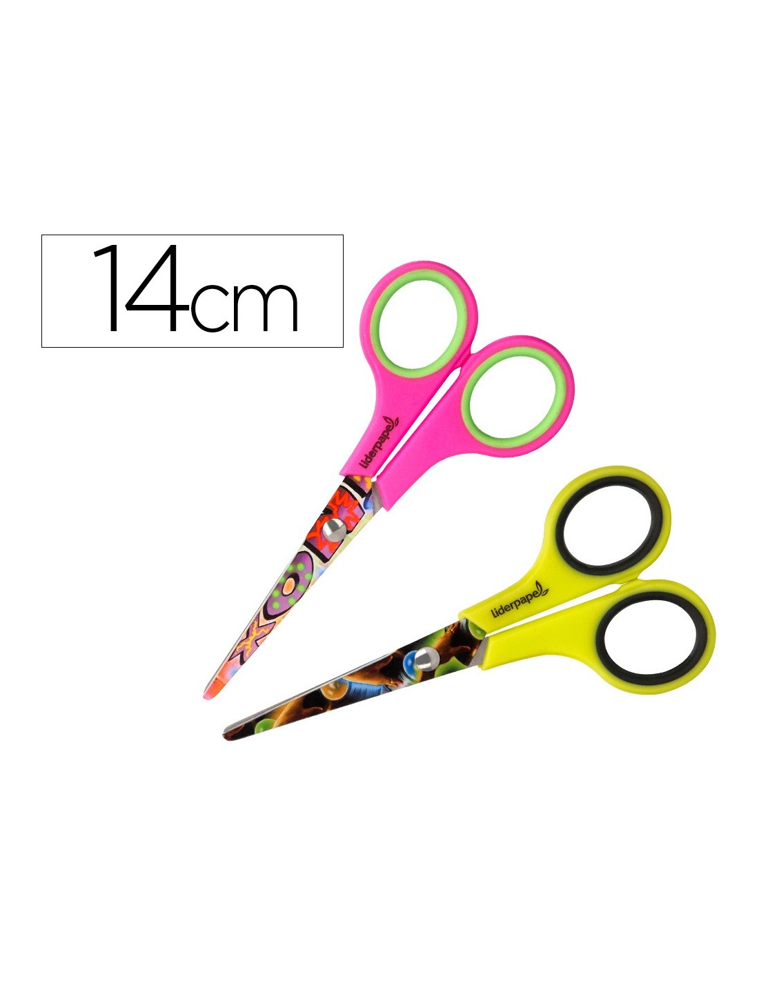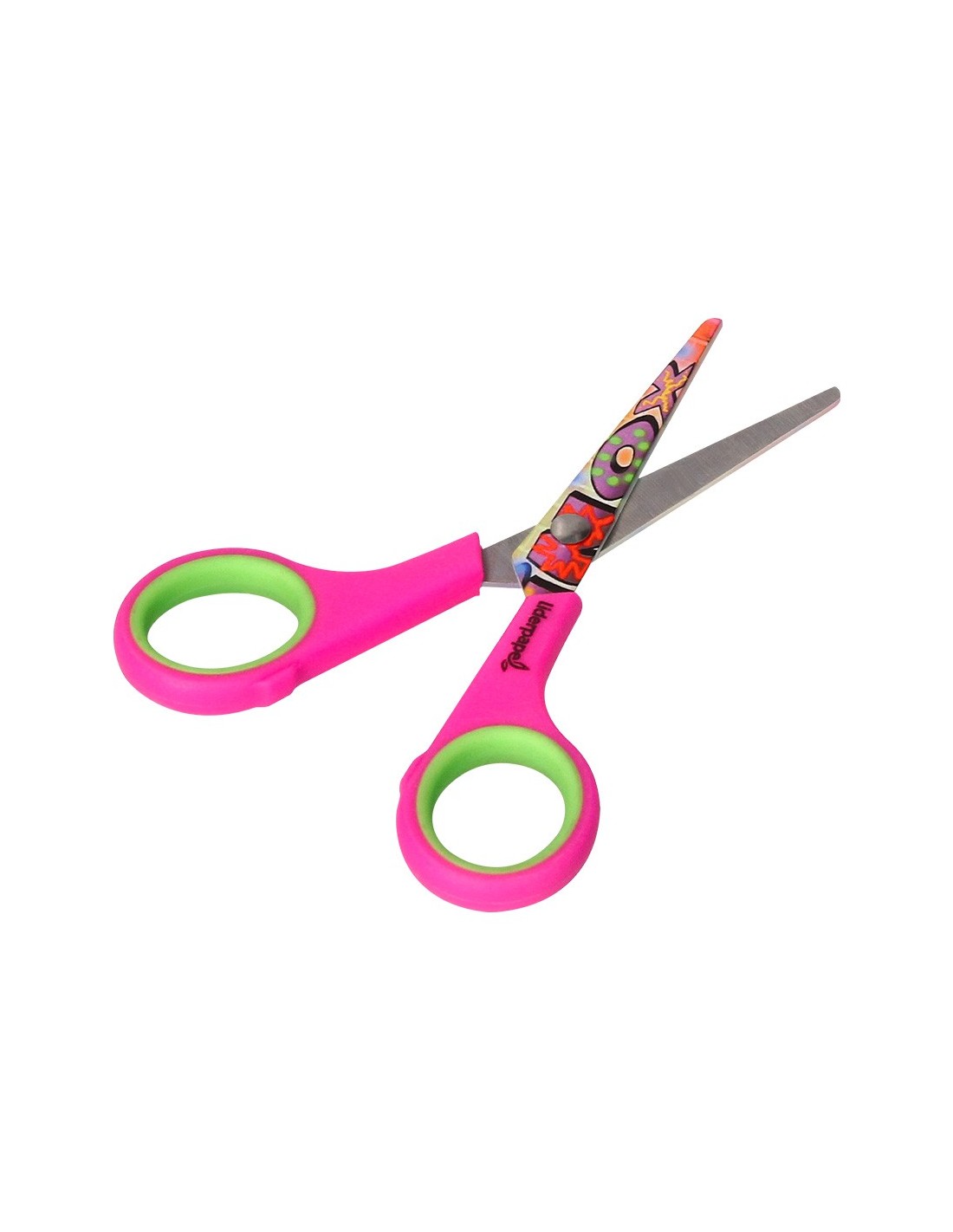 Hojas de acero inoxidable decoradas. Mango de plástico agradable al tacto. Punta redonda antipinchazos. Apta para TODOS LOS USOS. CORTA PAPEL, cartón, fotos, tela, etc. Longitud: 14 cm. SE RECOMIENDA UTILIZAR LAS TIJERAS BAJO LA SUPERVISION DE UN ADULTO
