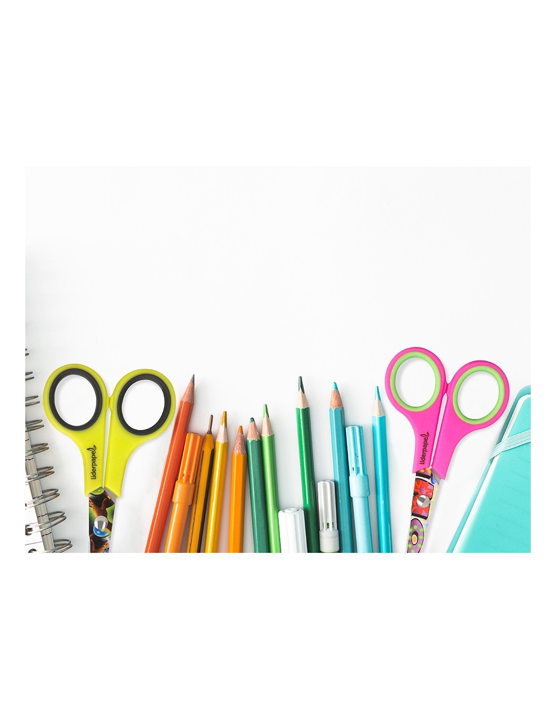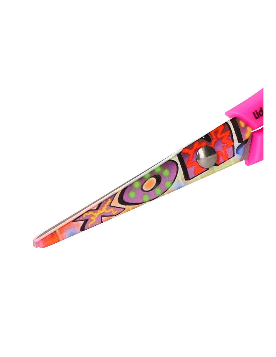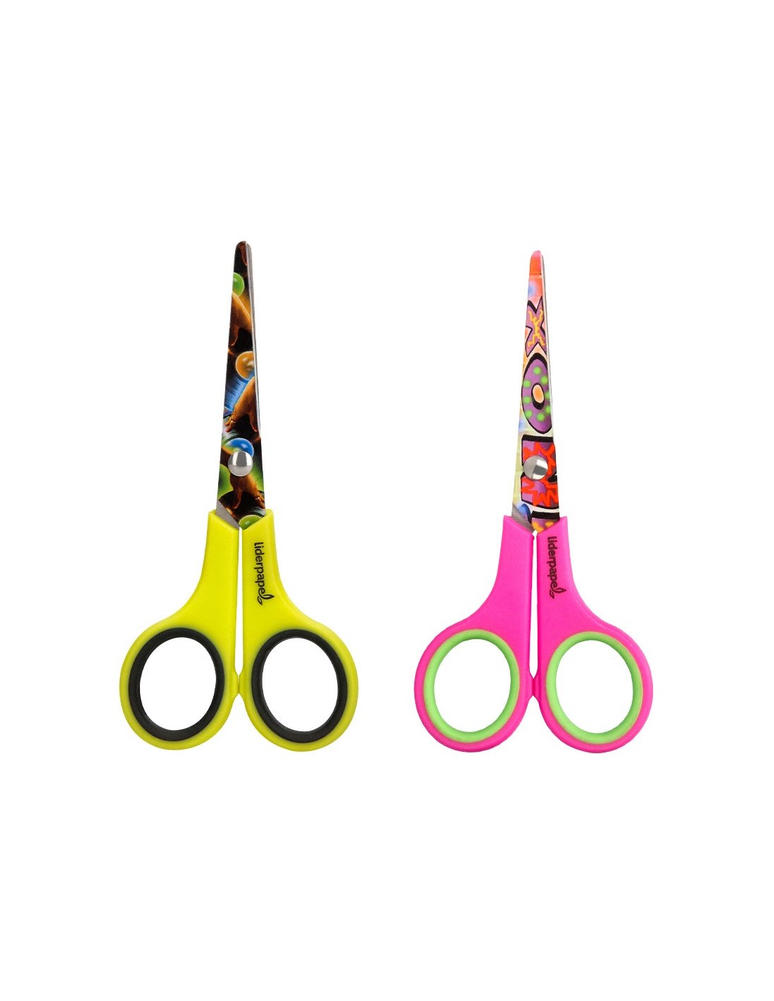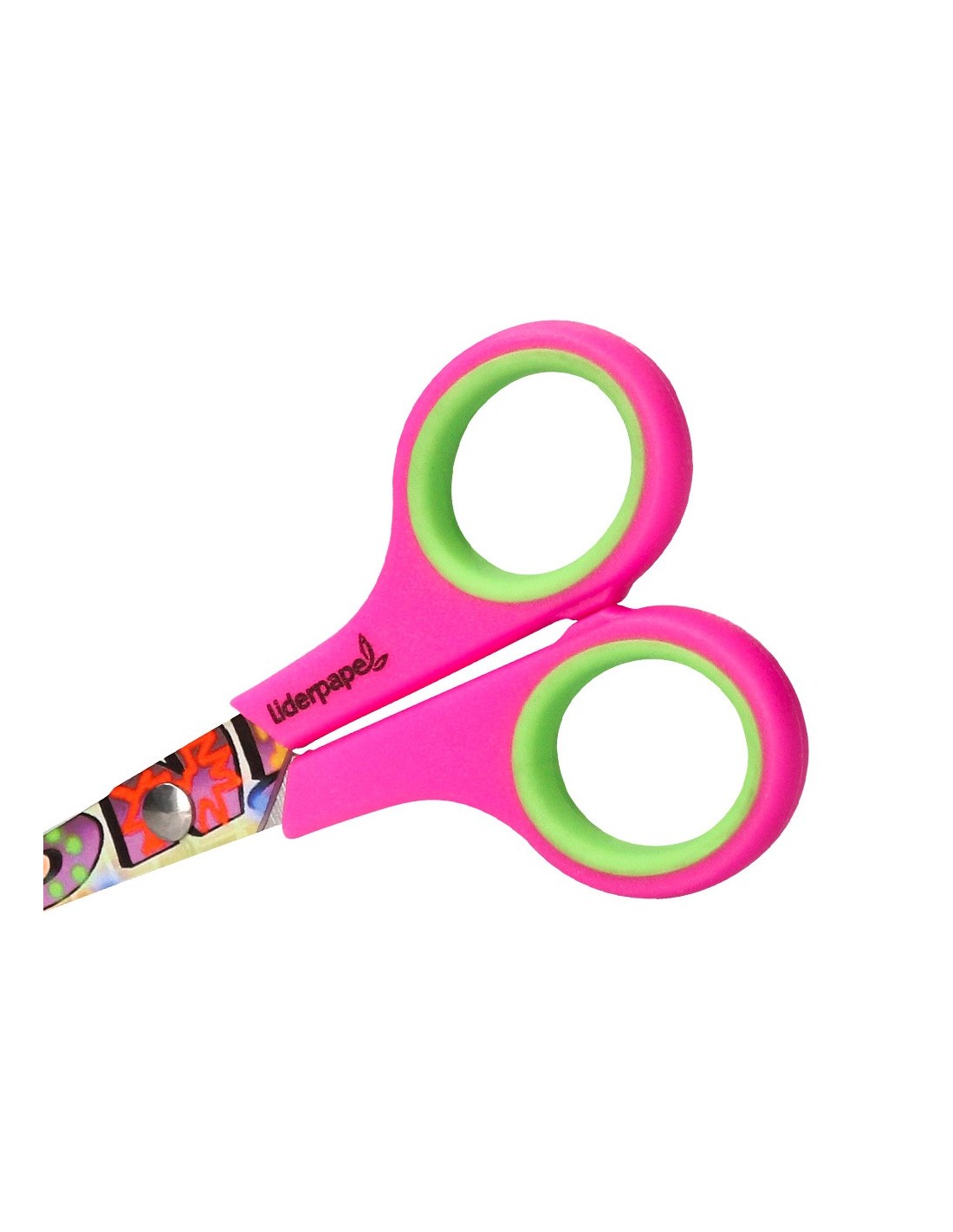 Hojas de acero inoxidable decoradas. Mango de plástico agradable al tacto. Punta redonda antipinchazos. Apta para TODOS LOS USOS. CORTA PAPEL, cartón, fotos, tela, etc. Longitud: 14 cm. SE RECOMIENDA UTILIZAR LAS TIJERAS BAJO LA SUPERVISION DE UN ADULTO