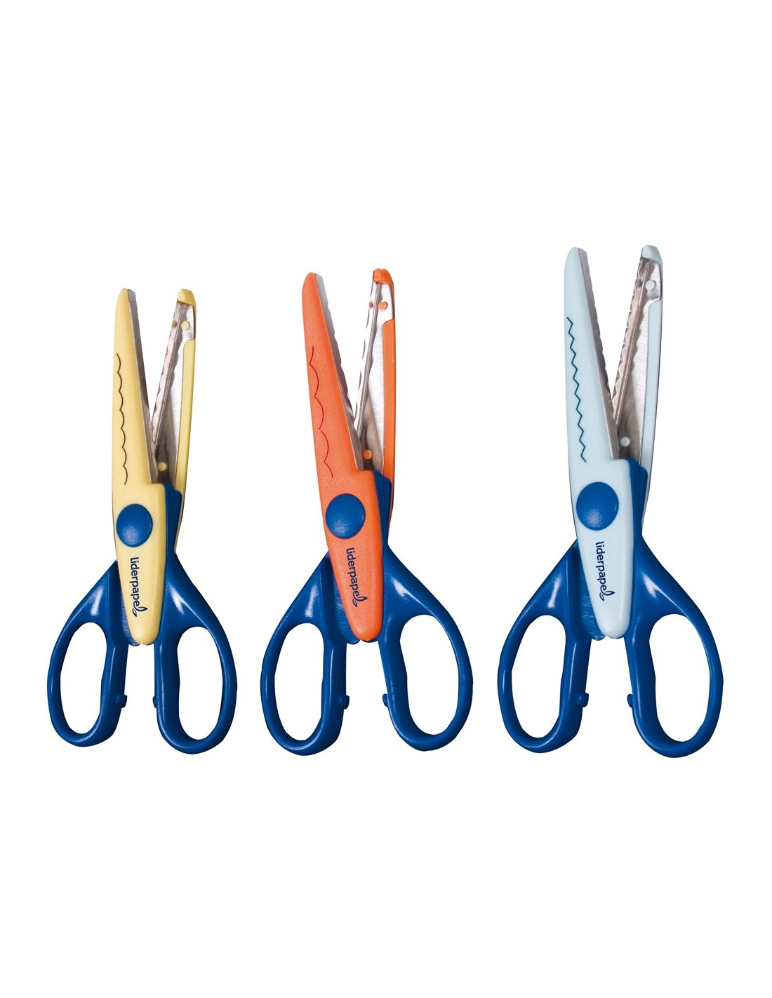 Indicada para manualidades. Tres tipos de corte surtidos: corte en zig-zag, corte en ondas pequeñas y corte en ondas grandes. Corta papel, fotos, tejidos, etc. Longitud: 16 cm. SE RECOMIENDA UTILIZAR LAS TIJERAS BAJO SUPERVISION DE UN ADULTO