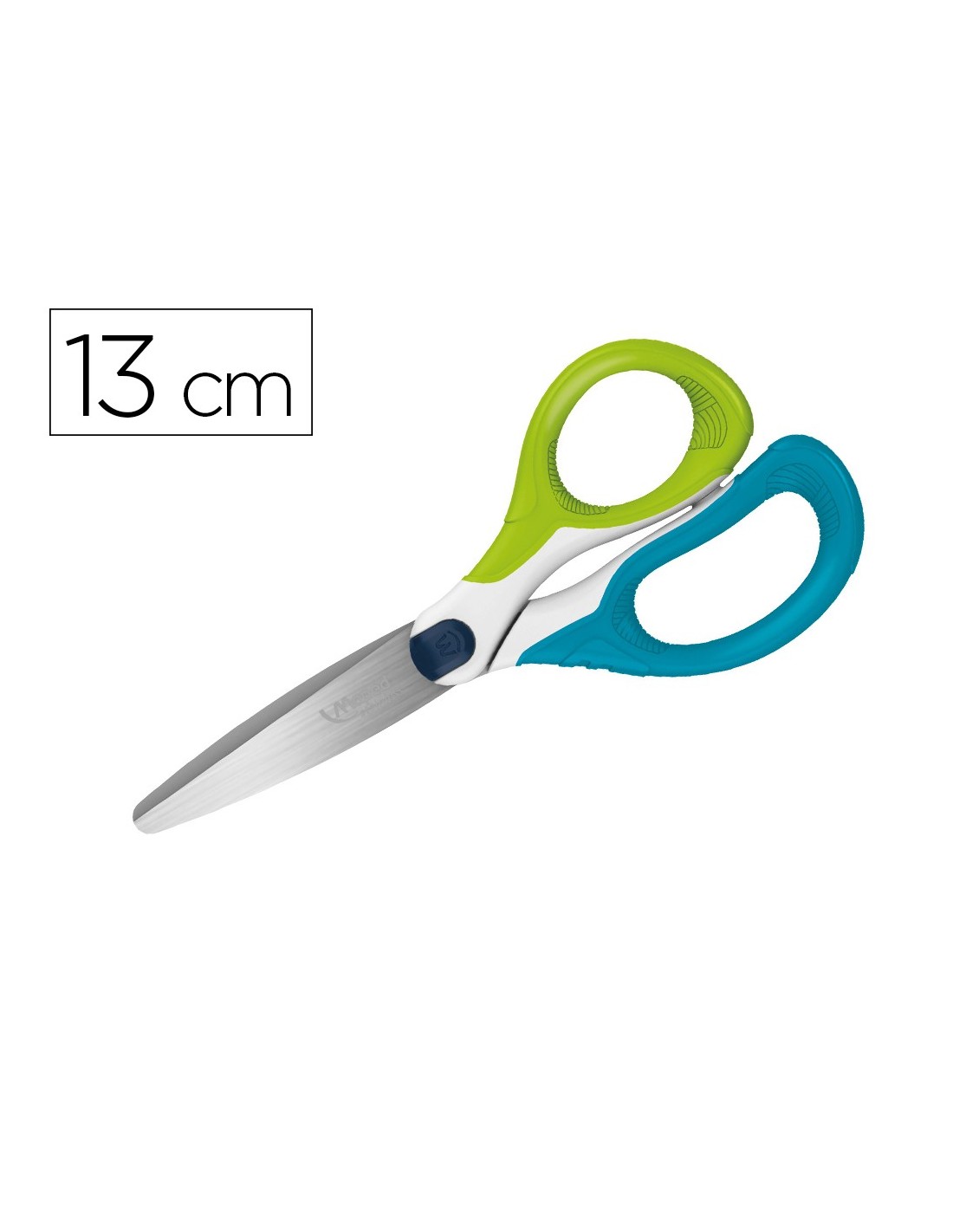 Tijera escolar asimétrica. Agarre ergonómico y flexible para ambidiestros. Tres modelos diferentes. Colores surtidos. Longitud: 13 cm.