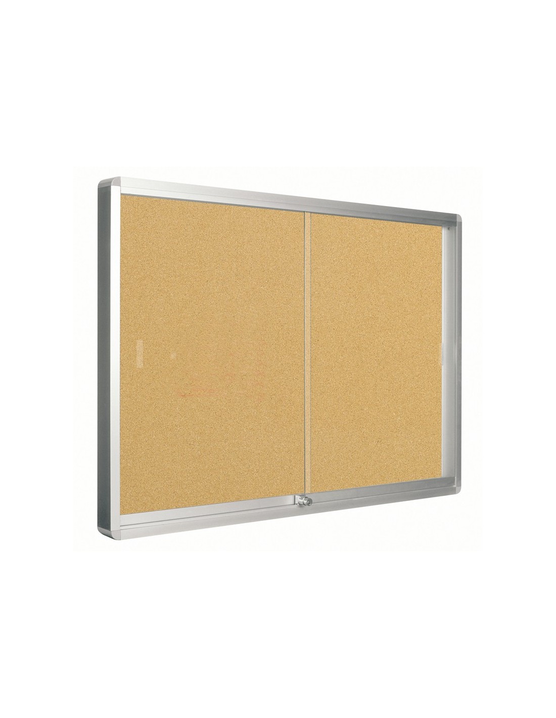 Con fondo de corcho, construida en aluminio anodizado. Puertas correderas de cristal de seguridad antirroturas de 5 mm de grosor y cerradura con 2 llaves. Provista de accesorios de fijación a la pared. Cantoneras redondeadas. Puerta de cristal. Fondo: 6 cm.