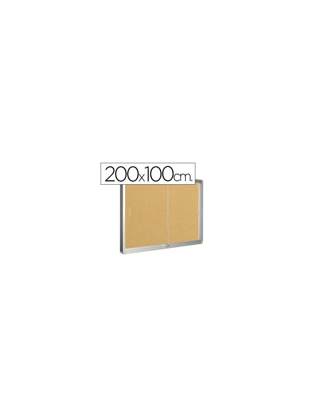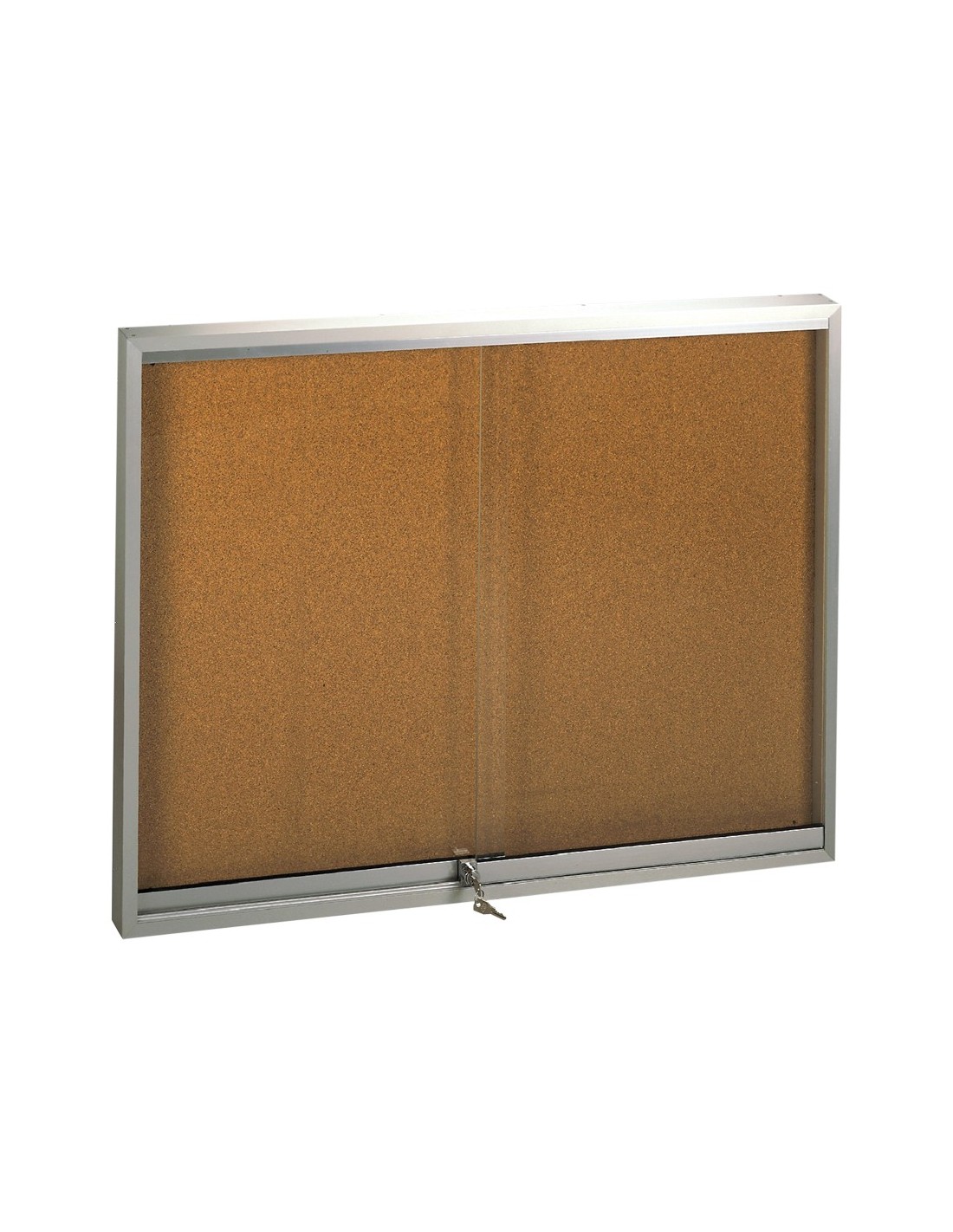 Con fondo de corcho, construida en aluminio anodizado. Puertas correderas de cristal de seguridad antirroturas de 5 mm de grosor y cerradura con 2 llaves. Provista de accesorios de fijación a la pared. Cantoneras redondeadas. Puerta de cristal. Fondo: 6 cm.