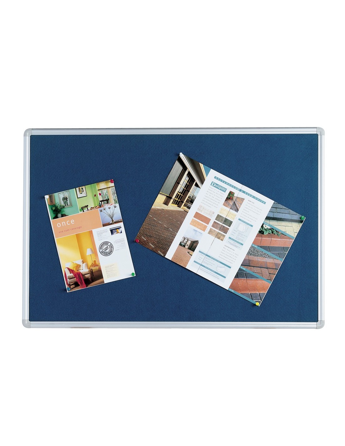 Con fondo azul, marco de aluminio y cantoneras redondeadas. Para uso en interiores. Fieltro resistente al fuego. Ideal para colgar publicidad, notas, avisos, pósteres, etc., mediante chinchetas o velcro. Provista de accesorios para su fijación a la pared. Fondo: 3 cm. Capacidad (DIN A4): 15. Medidas: 120 x 90 cm.