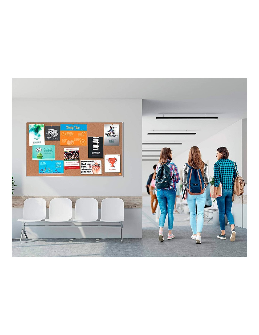 Tablero de anuncios de corcho de formato panorámico con un marco contemporáneo fino y discreto que ofrece una superficie de visualización más accesible y extensa. El sistema InvisaMount facilita la instalación y los soportes de sujeción están cuidadosamente ocultos tras el tablero. Tablero de anuncios con una excelente superficie de corcho para fijar y mostrar tus avisos. Medidas: 1880x1060mm.